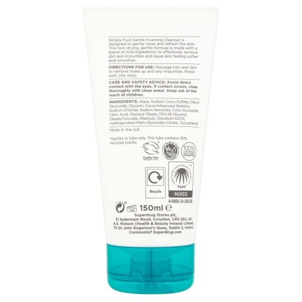 Product Information:Simply Pure Gentle Foaming Cleanser Is Designed To Gently Clean And Refresh The Skin,Features:This Non-Drying, Gentle Formula Is Made With A Blend Of Mild Ingredients To Effectively Remove Dirt And Impurities And Leave Skin Feeling Softer And Smoother,Warning Or Restrictions:Avoid Direct Contact With The Eyes. If Contact Occurs, Rinse Thoroughly With Clean Water. Keep Out Of The Reach Of Children,Product Specification:Aqua, Sodium Coco-Sulfate, Decyl Glucoside, Glycerin, Cocamidopropyl Betaine, Sodium Chloride, Sodium Benzoate, Coco-Glucoside, Glyceryl Oleate, Peg-18 Glyceryl Oleate/Cocoate, Allantoin, Citric Acid, Disodium Edta, Hydrogenated Palm Glycerides Citrate, Tocopherol,Product Uses:Massage Into Wet Skin To Break Down Make Up And Any Impurities, Rinse Well To Remove. Use Daily,Recyclable:Tube – 30% Pcr Recycled Cap- On Recycled