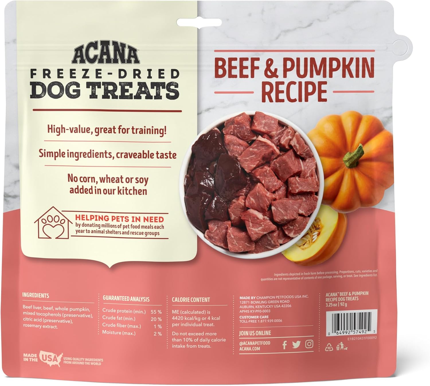 Make Training Time More Nutritious And Delicious With The Craveable Taste Found In Acana Singles Beef And Pumpkin Recipe Freeze Dried Dog Treats. These Grain Free* Dog Treats Are Perfect For Picky Dogs, Packed With Protein From A Single Animal Source To Reward Your Dog According To Their Innate Needs. At 4 Calories Per Dog Treat And Made With Just 3 Simple Ingredients**, These High Protein Acana Dog Treats Include Nourishing Beef Liver, Beef, And Delicious Whole Pumpkin. These Beef Dog Treats Are A Perfect Addition To Your Dog'S Daily Routine, Gently Freeze-Dried To Lock In Nutrients And A Flavor So Irresistible That Your Dog Will Drool As Soon As They See The Bag. Choose Acana Dog Treats To Give Your Companion The Nutritional Foundation They Need To Live A Happy, Healthy Life. *Produced In A Facility That Also Processes Grains**Plus Natural Preservatives And Flavors