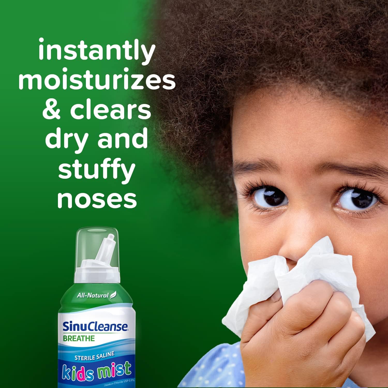 About this item Safe for Infants and Children of All Ages: SinuCleanse Sterile Saline Kids Nasal Spray delivers a low pressure, gentle mist to safely moisturize, flush and cleanse delicate nasal passages, allowing your child to breathe easier All-Natural Saline Spray for Babies and Kids: SinuCleanse Kids Saline Mist is sterile, all-natural and preservative free and its PH balanced system will not sting or burn delicate nasal passages, making it ideal for use in Newborns and Children of All Ages Soothes and Moisturizes: Our all-natural nasal mist instantly moistures your child's delicate nasal passages while helping to clear mucus and congestion associated with allergies and colds Doctor Recommended: SinuCleanse Infant Saline Nasal Spray is All-Natural, Preservative Free, and may be used as often as needed with other prescriptions and over-the-counter allergy and cold medications Made in USA and FDA Registered: All SinuCleanse nasal mist products are proudly manufactured in the USA in a FDA Registered Drug Facility to ensure safety and efficacy See more product details,Safe for Infants and Children of All Ages: SinuCleanse Sterile Saline Kids Nasal Spray delivers a low pressure, gentle mist to safely moisturize, flush and cleanse delicate nasal passages, allowing your child to breathe easier,All-Natural Saline Spray for Babies and Kids: SinuCleanse Kids Saline Mist is sterile, all-natural and preservative free and its PH balanced system will not sting or burn delicate nasal passages, making it ideal for use in Newborns and Children of All Ages,Soothes and Moisturizes: Our all-natural nasal mist instantly moistures your child's delicate nasal passages while helping to clear mucus and congestion associated with allergies and colds,Doctor Recommended: SinuCleanse Infant Saline Nasal Spray is All-Natural, Preservative Free, and may be used as often as needed with other prescriptions and over-the-counter allergy and cold medications,Made in USA and FDA Registered: All SinuCleanse nasal mist products are proudly manufactured in the USA in a FDA Registered Drug Facility to ensure safety and efficacy