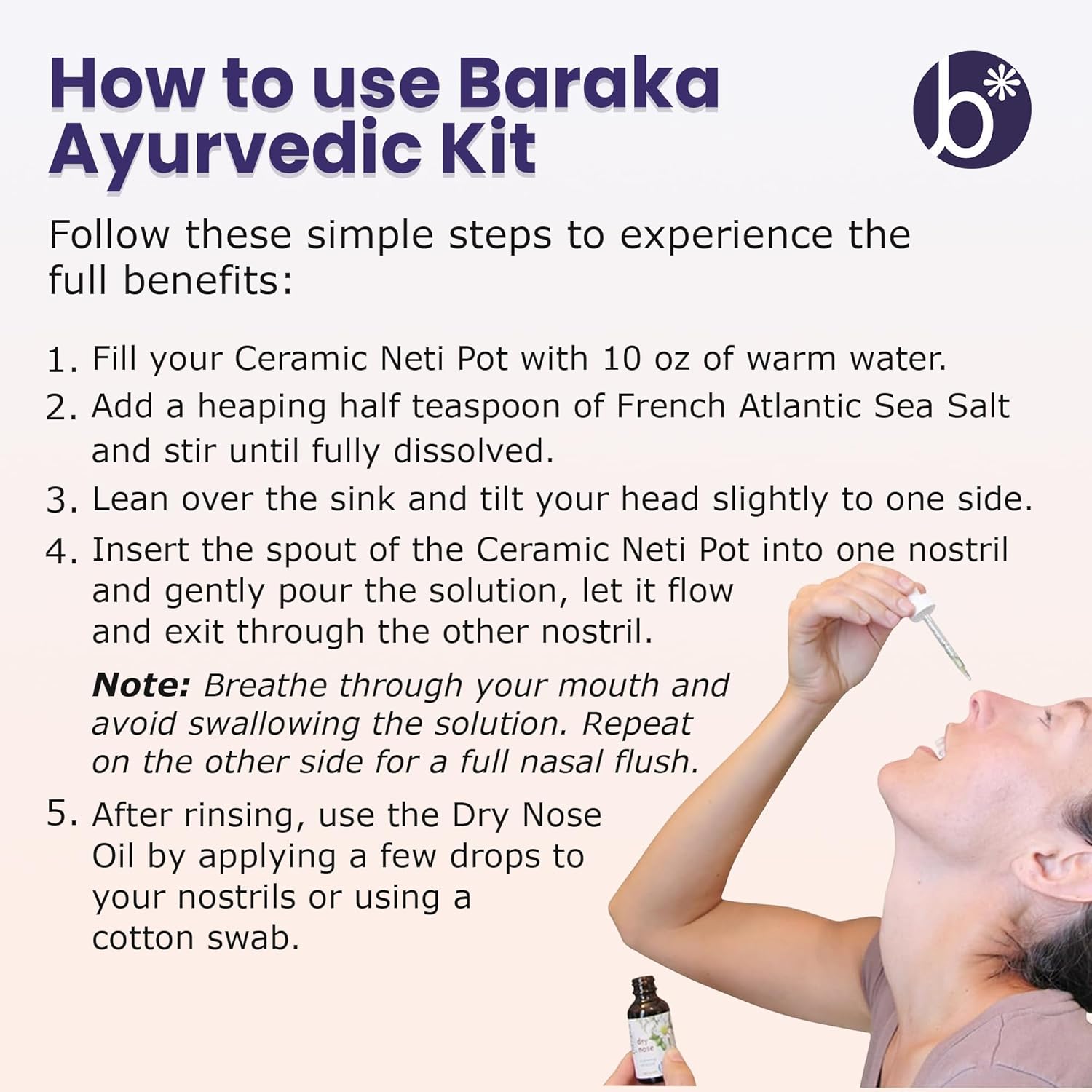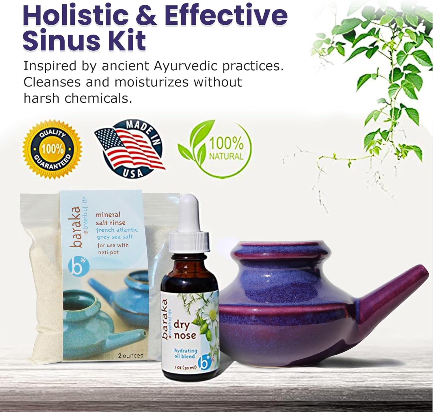 Sinus Ayurvedic Care Kit - Ceramic Neti Pot, Perfect For Sinus Relief. (1 Oz) Premium Quality Essential Oils And Mineral Salt Rinse (2 Oz)(Purple)