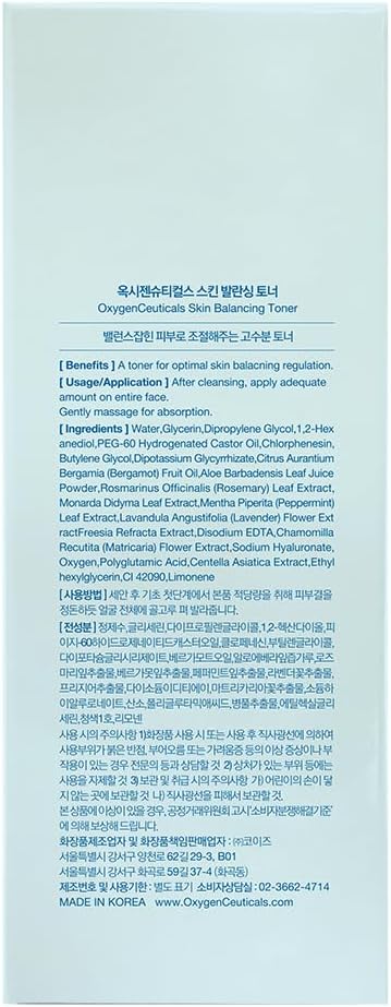 About this item BALANCES SKIN pH LEVELS: Enriched with six natural herbal ingredients to balance skin pH, improve skin complexion, and minimize pores. Removes pollutants below the skin's surface while protecting and soothing the skin from external irritants, leaving it firmer and healthier. GENTLY EXFOLIATES & RESTORES SKIN: Daily-use toner that gently exfoliates dead skin cells, leaving smoother and more refined skin. Suitable for all skin types, including normal, dry, oily, combination, and sensitive skin. Purifies, softens, and replenishes skin by retaining optimal moisture. PREMIUM NATURAL INGREDIENTS: Formulated with Lavender Oil, Centella Asiatica Leaf, Peppermint Leaf, and Aloe Barbadensis Leaf to soften, soothe, and vitalize the skin. Ideal for addressing dryness, dullness, and skin texture, this natural toner is suitable for both women and men. PREMIUM SKINCARE FOR PROFESSIONAL RESULTS: OxygenCeuticals delivers spa-quality skincare to your daily routine with pharmaceutical-grade ingredients and advanced formulation technology; used by professionals for visible, long-lasting results and enhanced skin health. DERMATOLOGIST-APPROVED FOR ADVANCED CARE: Used by leading dermatologists and aesthetic experts, OxygenCeuticals is ideal for pre- and post-treatment care; used in over 600 aesthetic clinics in South Korea to support sensitive and treated skin. DERMATOLOGIST RECOMMENDED SKIN CARE PRODUCTS: OxygenCeuticals has grown to be a trusted medical aesthetic skincare brand, and its products are used by dermatologists, plastic surgeons and medical aesthetic professionals in more than 600 famous aesthetic institutions in South Korea alone. Medical aesthetic professionals use and recommend OxygenCeuticals products to complement, before- and after-laser skin care procedures. See more product details,BALANCES SKIN pH LEVELS: Enriched with six natural herbal ingredients to balance skin pH, improve skin complexion, and minimize pores. Removes pollutants below the skin's surface while protecting and soothing the skin from external irritants, leaving it firmer and healthier,GENTLY EXFOLIATES & RESTORES SKIN: Daily-use toner that gently exfoliates dead skin cells, leaving smoother and more refined skin. Suitable for all skin types, including normal, dry, oily, combination, and sensitive skin. Purifies, softens, and replenishes skin by retaining optimal moisture,PREMIUM NATURAL INGREDIENTS: Formulated with Lavender Oil, Centella Asiatica Leaf, Peppermint Leaf, and Aloe Barbadensis Leaf to soften, soothe, and vitalize the skin. Ideal for addressing dryness, dullness, and skin texture, this natural toner is suitable for both women and men,PREMIUM SKINCARE FOR PROFESSIONAL RESULTS: OxygenCeuticals delivers spa-quality skincare to your daily routine with pharmaceutical-grade ingredients and advanced formulation technology; used by professionals for visible, long-lasting results and enhanced skin health,DERMATOLOGIST-APPROVED FOR ADVANCED CARE: Used by leading dermatologists and aesthetic experts, OxygenCeuticals is ideal for pre- and post-treatment care; used in over 600 aesthetic clinics in South Korea to support sensitive and treated skin,DERMATOLOGIST RECOMMENDED SKIN CARE PRODUCTS: OxygenCeuticals has grown to be a trusted medical aesthetic skincare brand, and its products are used by dermatologists, plastic surgeons and medical aesthetic professionals in more than 600 famous aesthetic institutions in South Korea alone. Medical aesthetic professionals use and recommend OxygenCeuticals products to complement, before- and after-laser skin care procedures