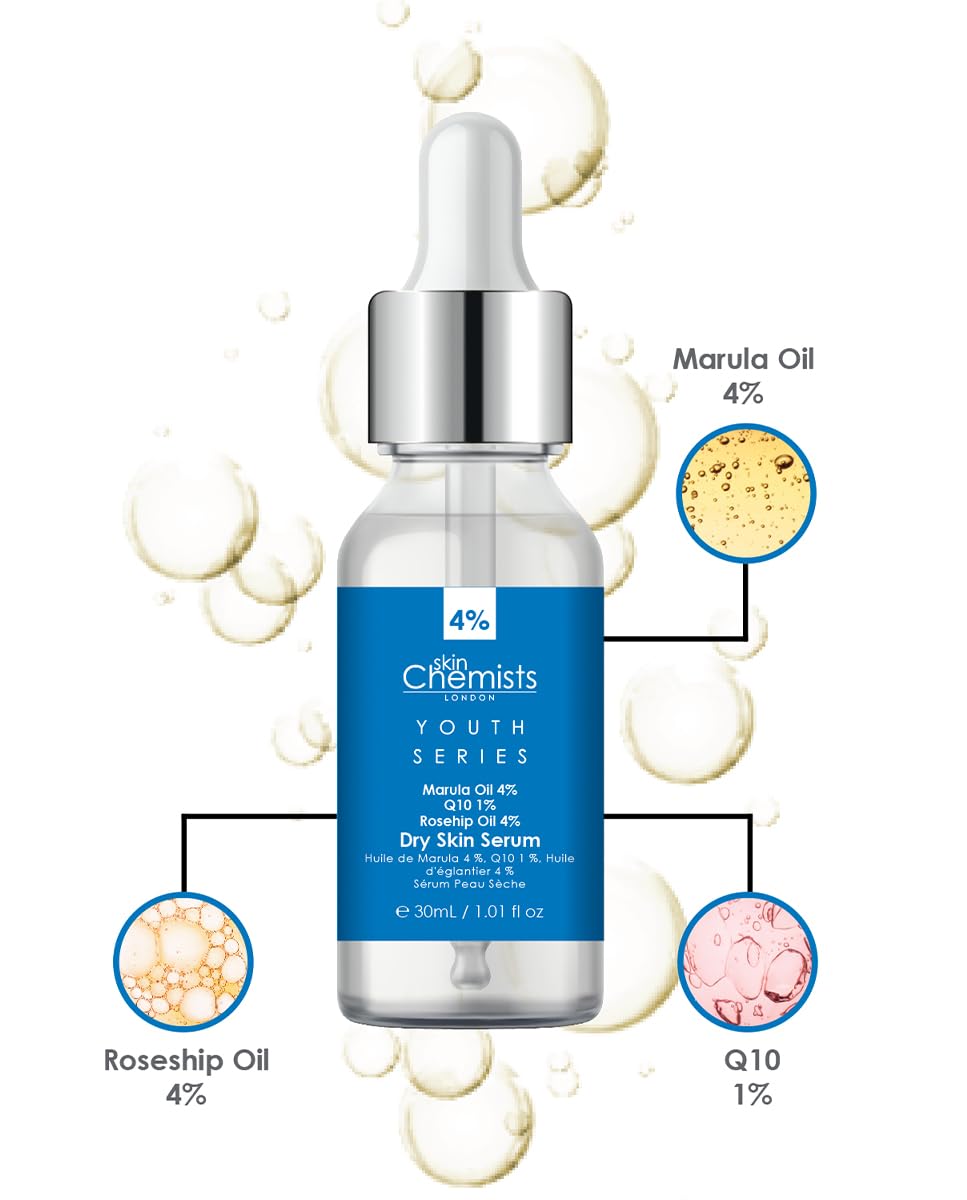 About this item INTENSE HYDRATION BLEND: Our Skin Chemists hydrating serum Dry Skin face serum features a potent blend of ingredients including 4% Marula Oil, 1% CoQ10, and 4% Rosehip Oil. These ingredients work synergistically to combat dehydrated skin. MARULA OIL FOR MOISTURE: Infused with 4% Marula Oil, rich in amino acids, this face serum deeply moisturizes, enhancing skin's moisture retention and overall health, leaving you with a revitalized complexion. COQ10 ANTIOXIDANT BOOST: Formulated with 1% CoQ10, this dry skin serum aims to elevate skin's antioxidant levels. Experience a temporary increase in the skin's antioxidant capacity, helping to defend against environmental stressors. ROSEHIP OIL NOURISHMENT: Packed with 4% Rosehip Oil, this face serum nourishes your skin intensely, providing vital hydration and assisting in addressing the appearance of blemishes, giving you a smoother and clearer complexion. TARGETED SKIN REJUVENATION: Skin Chemists Dry Skin face serum is designed to target and combat dehydrated skin concerns effectively. This luxurious cocktail of ingredients supports skin's health, leaving it hydrated, radiant, and visibly rejuvenated. See more product details,INTENSE HYDRATION BLEND: Our Skin Chemists hydrating serum Dry Skin face serum features a potent blend of ingredients including 4% Marula Oil, 1% CoQ10, and 4% Rosehip Oil. These ingredients work synergistically to combat dehydrated skin,MARULA OIL FOR MOISTURE: Infused with 4% Marula Oil, rich in amino acids, this face serum deeply moisturizes, enhancing skin's moisture retention and overall health, leaving you with a revitalized complexion,COQ10 ANTIOXIDANT BOOST: Formulated with 1% CoQ10, this dry skin serum aims to elevate skin's antioxidant levels. Experience a temporary increase in the skin's antioxidant capacity, helping to defend against environmental stressors,ROSEHIP OIL NOURISHMENT: Packed with 4% Rosehip Oil, this face serum nourishes your skin intensely, providing vital hydration and assisting in addressing the appearance of blemishes, giving you a smoother and clearer complexion,TARGETED SKIN REJUVENATION: Skin Chemists Dry Skin face serum is designed to target and combat dehydrated skin concerns effectively. This luxurious cocktail of ingredients supports skin's health, leaving it hydrated, radiant, and visibly rejuvenated
