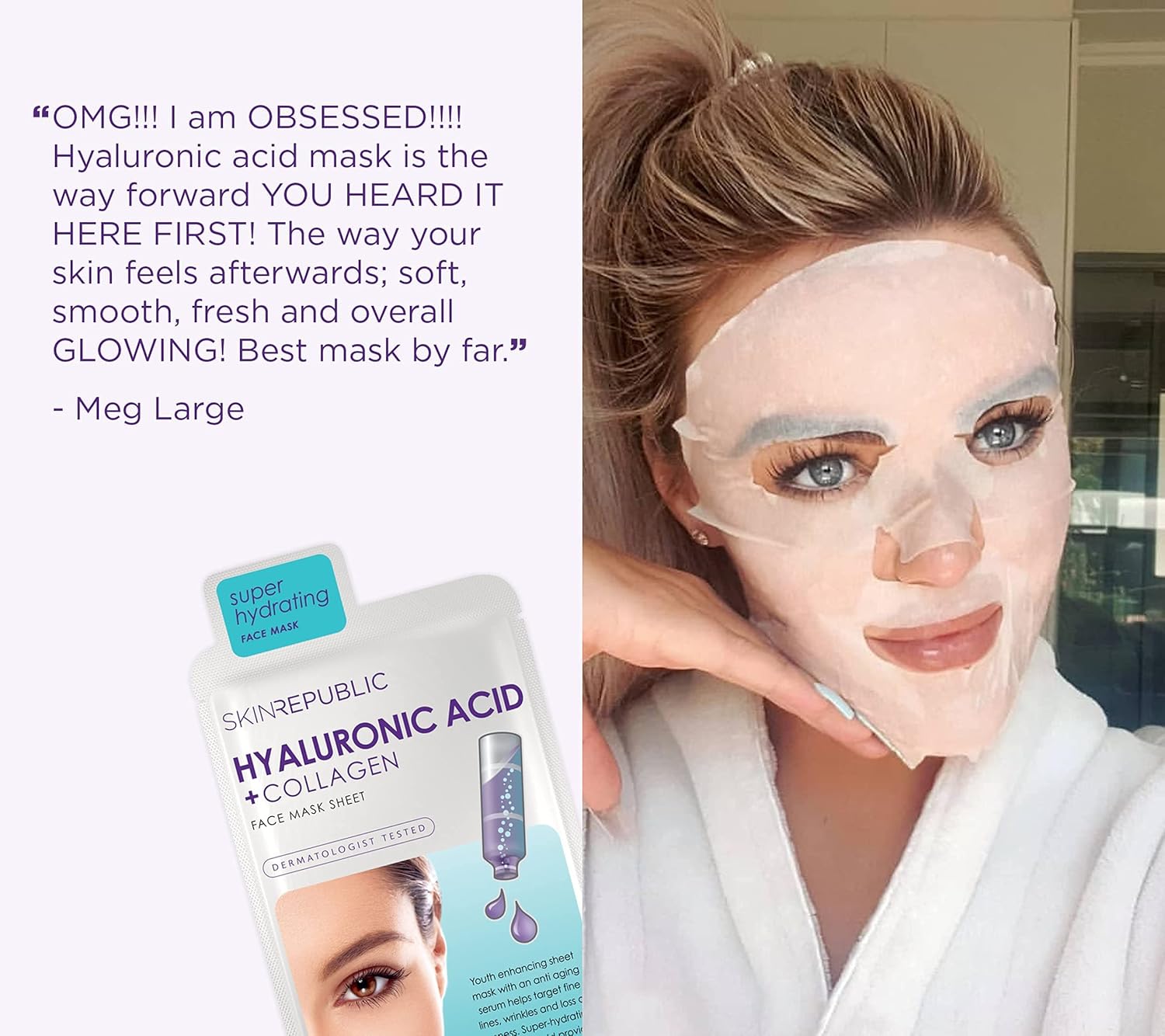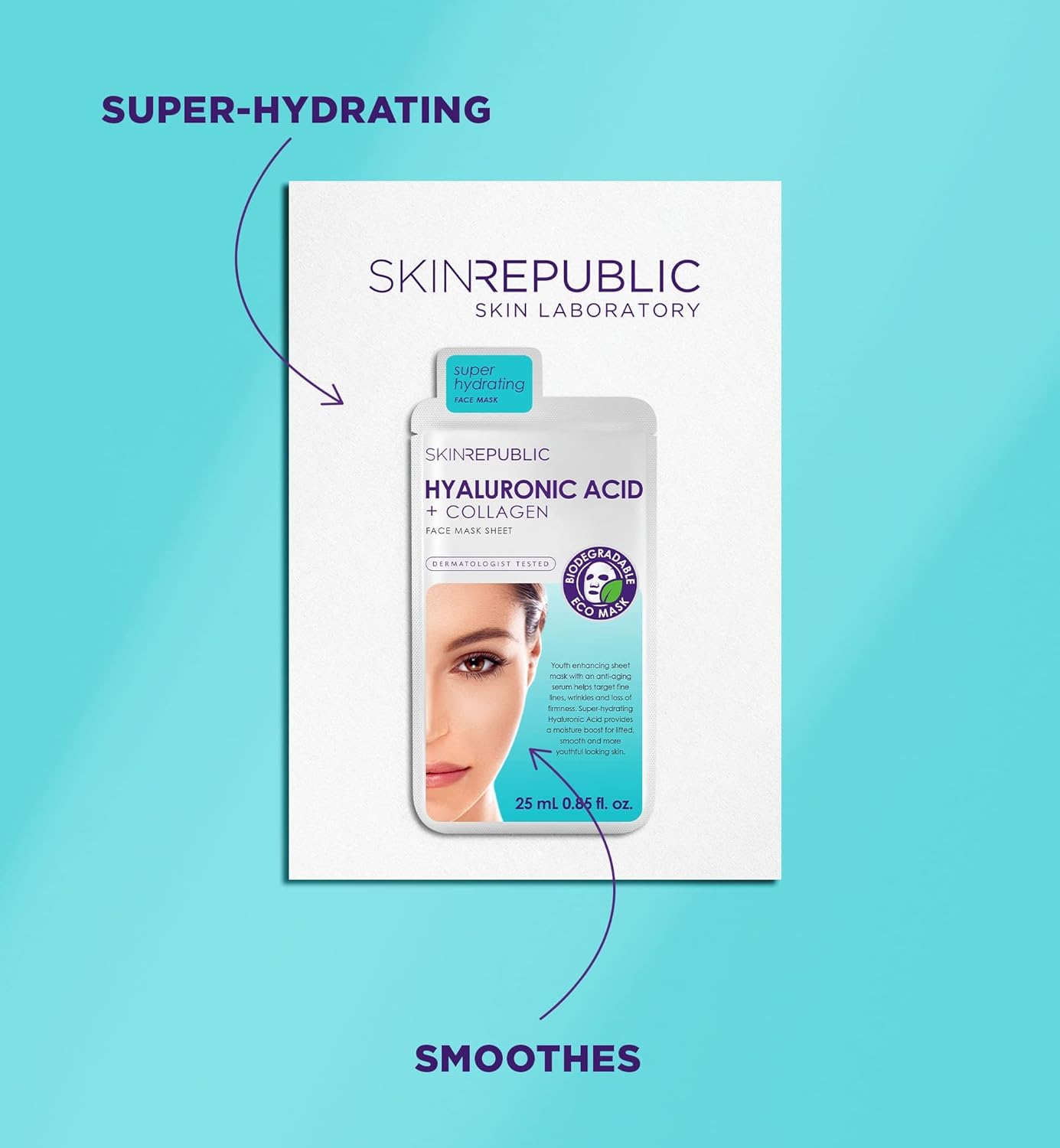 Skin Republic Hyaluronic Acid + Collagen Sheet Mask Clinically Proven To Provide 48-Hours Of Long-Lasting Hydration. Made In Korea