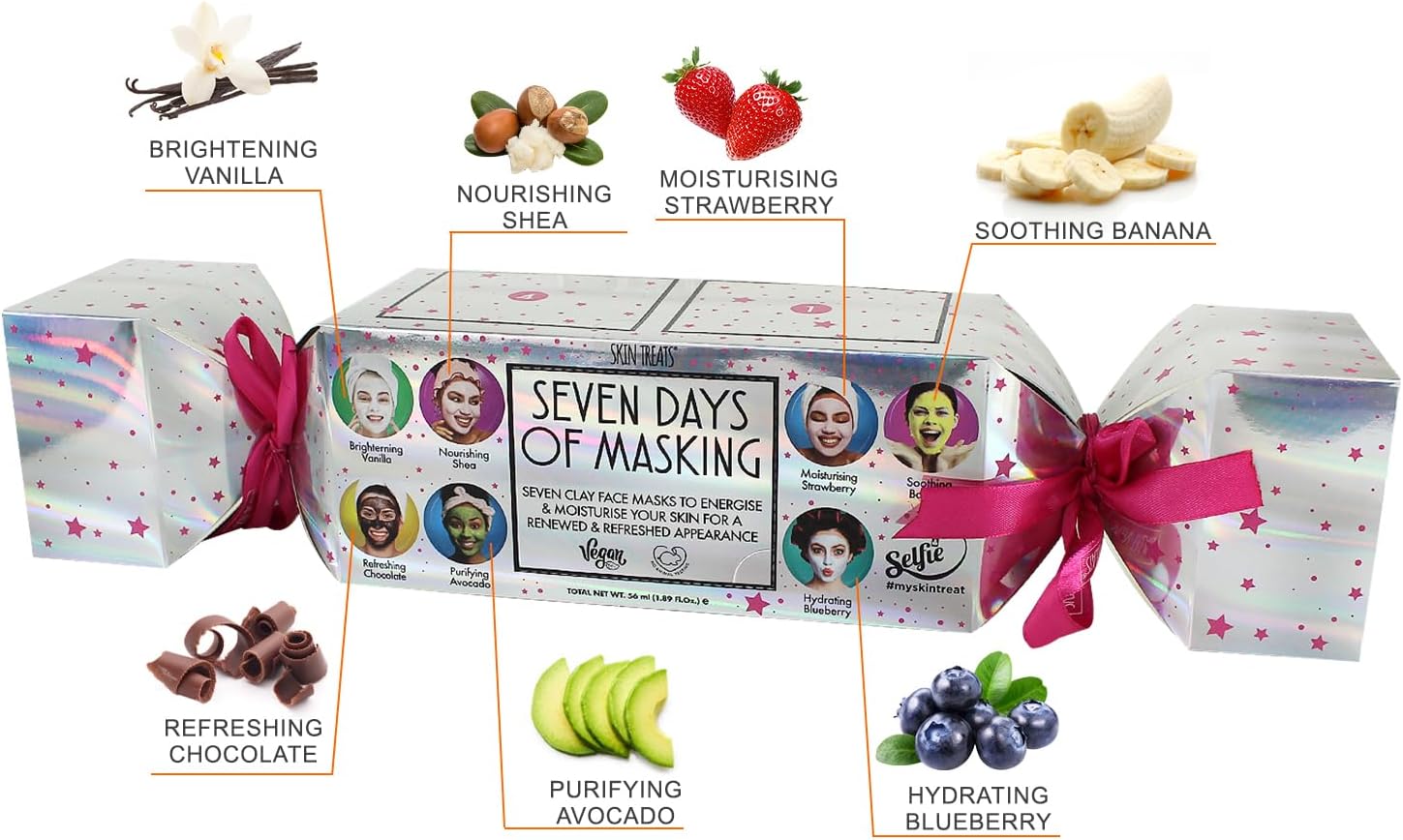 Skin Treats Seven Days Of Masking Christmas Cracker Gift Set | Dual Acton Clay Masks | Bentonite & Kaolin Clay | Rejuvenates & Nourishes | Vegan | Not Tested On Animals
