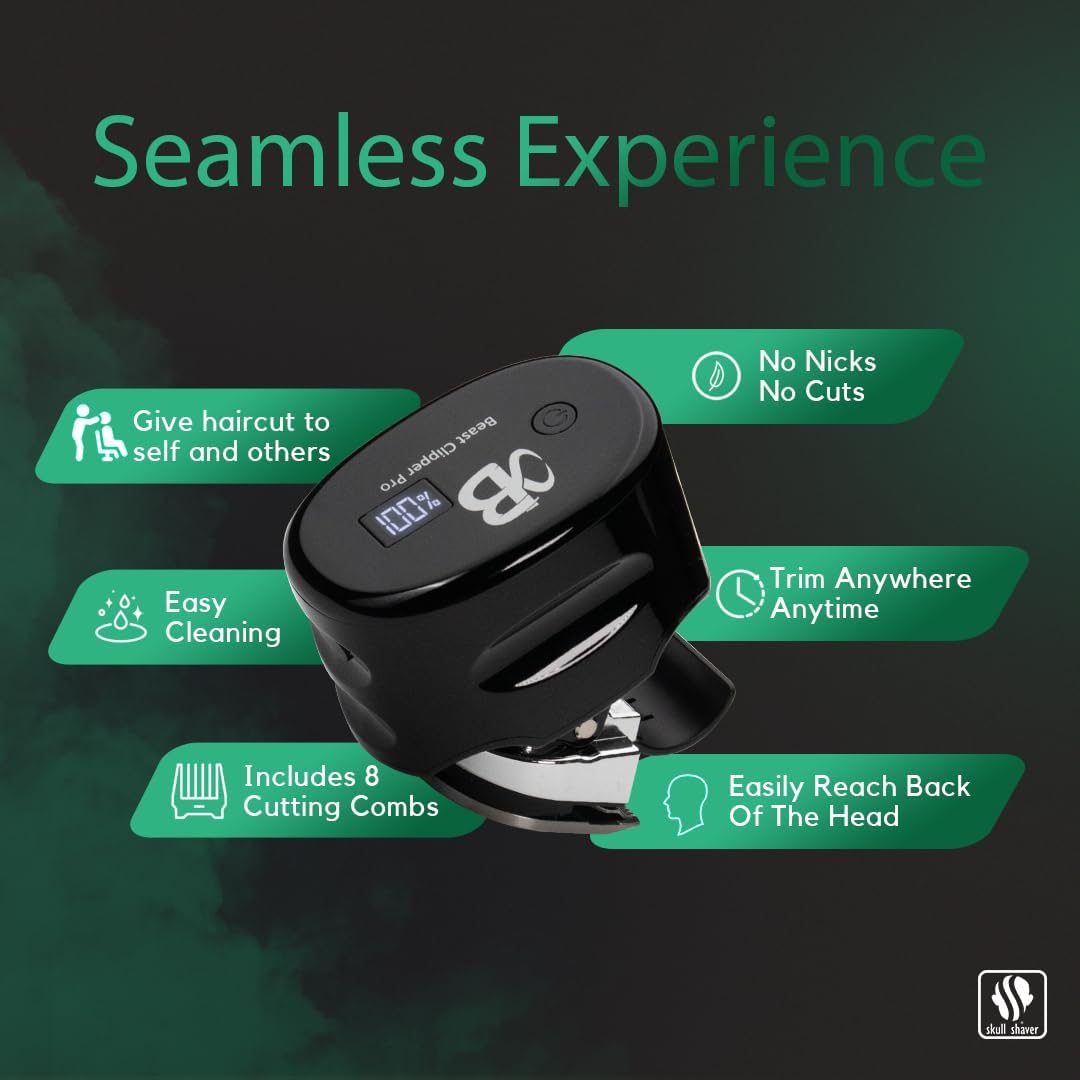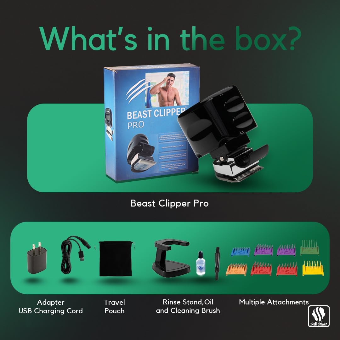 About this item Precision DIY and Professional Haircuts: Engineered for both self-grooming and giving haircuts to others, the Skull Shaver Beast Clipper Pro offers professional-level precision at home, featuring a DIY haircut machine and haircut tools for men High-Performance Japanese Steel Blades: Designed to last, our clippers are equipped with durable Japanese steel blades capable of delivering up to 90 haircuts per blade, ideal for both men's and women's haircuts Cordless Convenience for Everywhere Use: With up to 90 minutes of battery life, enjoy the flexibility of cordless operation, allowing you to give haircuts anywhere, anytime—ideal for busy individuals and professionals alike Customizable Styling Experience: Comes with eight cutting combs and adjustable guards, this haircut clippers kit provides versatile styling options, ensuring precise cuts for anyone’s hair length or style Effortless Maintenance for Longevity: Simple cleaning and maintenance keep the Beast Clipper Pro in pristine condition, ready for both personal grooming sessions and providing haircuts to others See more product details,Precision DIY and Professional Haircuts: Engineered for both self-grooming and giving haircuts to others, the Skull Shaver Beast Clipper Pro offers professional-level precision at home, featuring a DIY haircut machine and haircut tools for men,High-Performance Japanese Steel Blades: Designed to last, our clippers are equipped with durable Japanese steel blades capable of delivering up to 90 haircuts per blade, ideal for both men's and women's haircuts,Cordless Convenience for Everywhere Use: With up to 90 minutes of battery life, enjoy the flexibility of cordless operation, allowing you to give haircuts anywhere, anytime—ideal for busy individuals and professionals alike,Customizable Styling Experience: Comes with eight cutting combs and adjustable guards, this haircut clippers kit provides versatile styling options, ensuring precise cuts for anyone’s hair length or style,Effortless Maintenance for Longevity: Simple cleaning and maintenance keep the Beast Clipper Pro in pristine condition, ready for both personal grooming sessions and providing haircuts to others