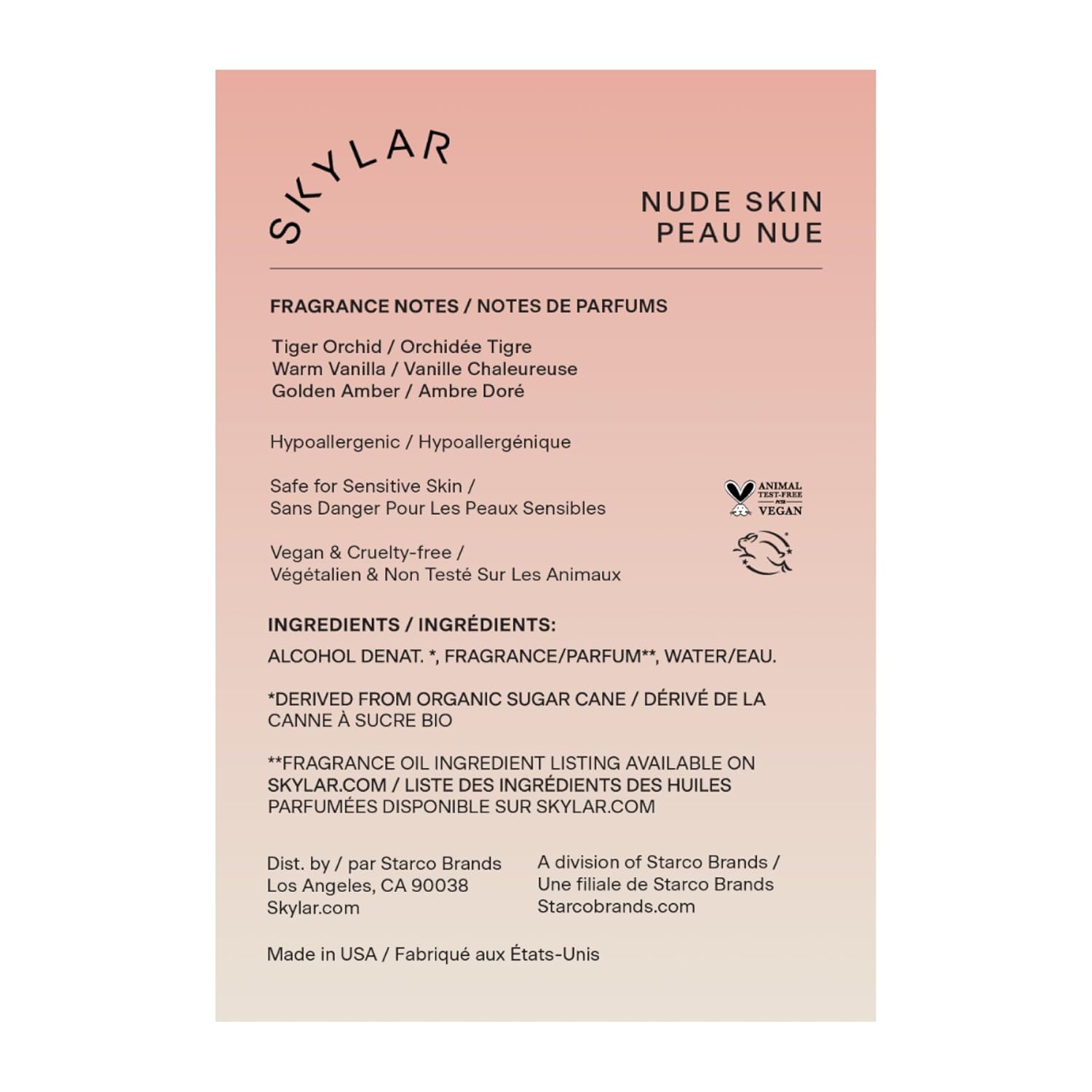 About this item Nude skin wraps you in a radiant blend of tiger orchid, warm vanilla, and golden amber – an irresistible fragrance that feels like the softest silk on bare skin. Both comforting and unforgettable, it’s our most intimate scent yet. Inviting Scents: Top notes: Pineapple Splash, Papaya Smoothie, Starfruit. Middle notes: Tiger Orchid, Coconut Blossom, Frangipani. Base notes: Warm Vanilla, Golden Amber, Upcycled Cedar. Clean Fragrance for Women: Skylar's clean beauty perfumes for women are hypoallergenic, vegan, and cruelty-free, ensuring they are safe for sensitive skin. These fragrances are formulated without parabens, phthalates, sulfates, synthetic dyes, or any harmful chemicals, reflecting a commitment to purity and safety. Wear and Pair: Our fragrances are crafted to be worn alone for a signature scent or layered together to create a fragrance that's uniquely you. This perfume pairs beautifully with Boardwalk Delight and Lime Sands, allowing you to customize your scent experience to match your mood and style. Responsible Fine Fragrance: We exceed the strictest global regulatory standards to ensure your skin's safety. Our ingredient policy, developed with a toxicologist, intentionally excludes harmful substances, reflecting our commitment to both quality and well-being.  See more product details,Nude skin wraps you in a radiant blend of tiger orchid, warm vanilla, and golden amber – an irresistible fragrance that feels like the softest silk on bare skin. Both comforting and unforgettable, it’s our most intimate scent yet,Inviting Scents: Top notes: Pineapple Splash, Papaya Smoothie, Starfruit. Middle notes: Tiger Orchid, Coconut Blossom, Frangipani. Base notes: Warm Vanilla, Golden Amber, Upcycled Cedar,Clean Fragrance for Women: Skylar's clean beauty perfumes for women are hypoallergenic, vegan, and cruelty-free, ensuring they are safe for sensitive skin. These fragrances are formulated without parabens, phthalates, sulfates, synthetic dyes, or any harmful chemicals, reflecting a commitment to purity and safety,Wear and Pair: Our fragrances are crafted to be worn alone for a signature scent or layered together to create a fragrance that's uniquely you. This perfume pairs beautifully with Boardwalk Delight and Lime Sands, allowing you to customize your scent experience to match your mood and style,Responsible Fine Fragrance: We exceed the strictest global regulatory standards to ensure your skin's safety. Our ingredient policy, developed with a toxicologist, intentionally excludes harmful substances, reflecting our commitment to both quality and well-being