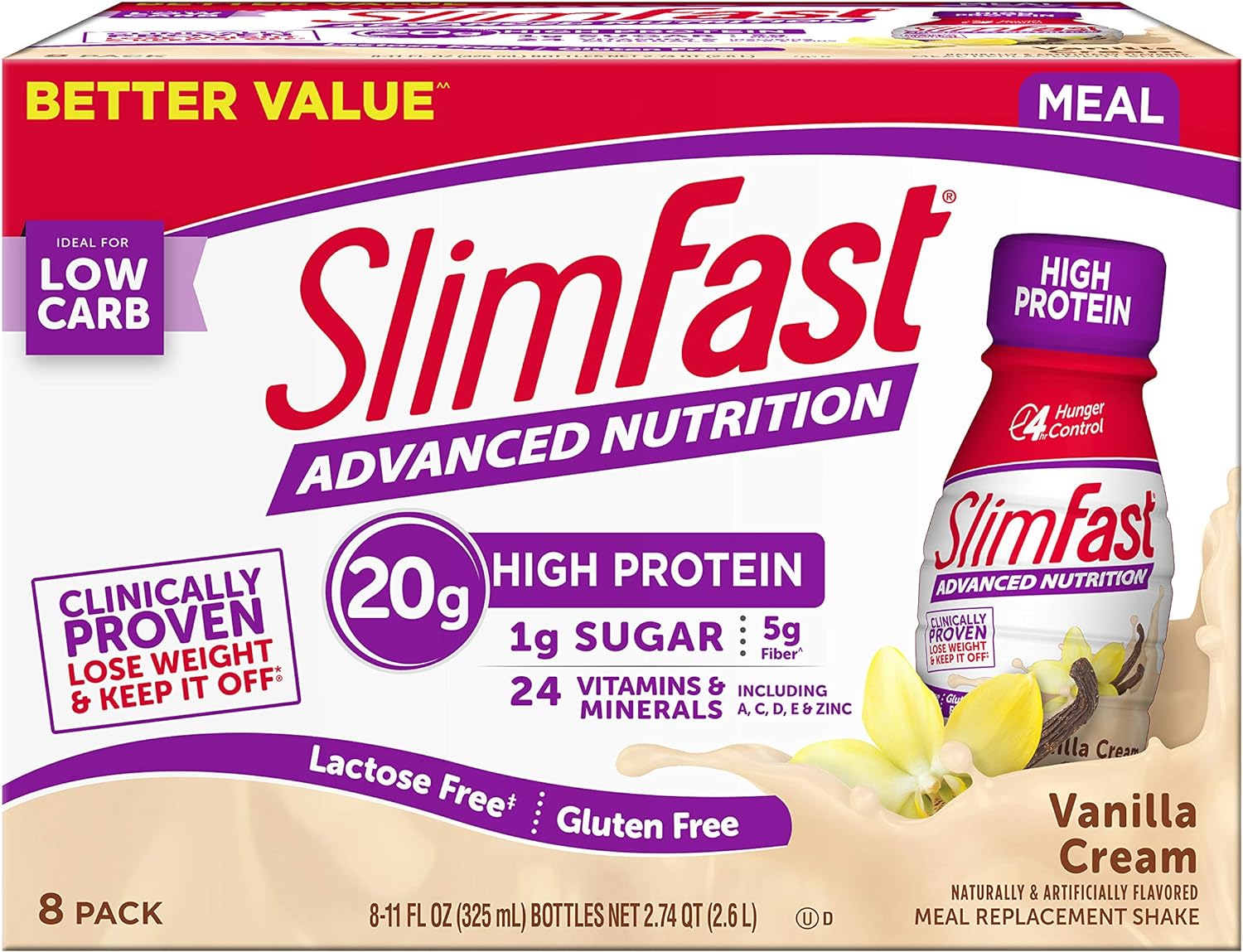 Shake up your day with Advanced Nutrition Vanilla Cream. After one sip, you might start using “vanilla” as a synonym for “exciting.” Delicious and nutritious, it’s packed with 20g of protein, 5g of fiber and 24 vitamins and minerals with only 1g of sugar. This shake is rich, creamy and sweet, yet low in carbs and sugar. It’s the perfect way to lose weight — and keep it off. Part of the clinically proven SlimFast Plan, these shakes make weight loss as easy as 1-2-3. Enjoy one sensible meal, two SlimFast meal replacements, and three snacks. The SlimFast Plan is clinically proven to help you lose weight fast and keep it off!
