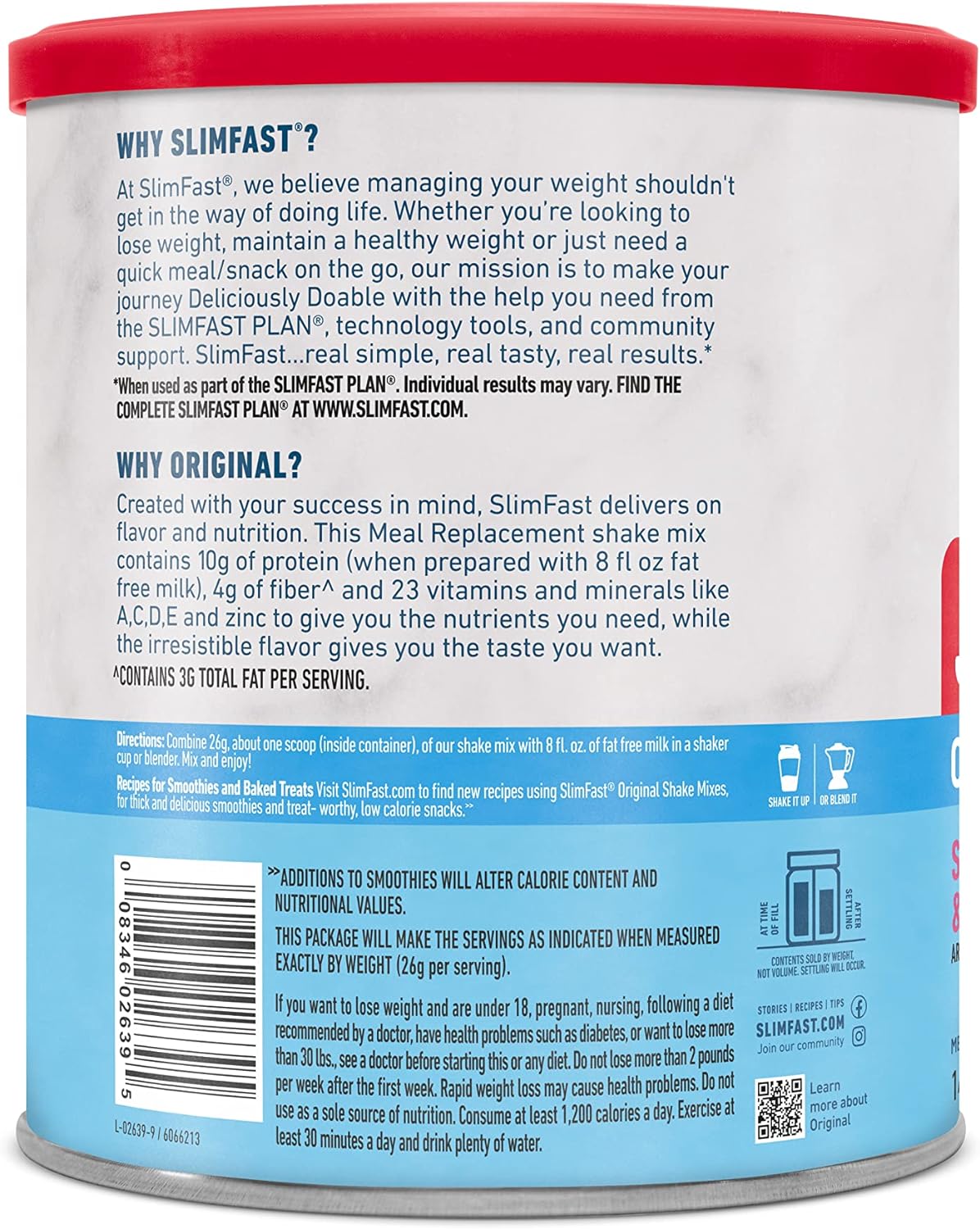 3 >PACKED WITH PROTEIN, VITAMINS, & MINERALS, The SlimFast Original meal replacement Shake Mix Powder is a balanced formula packed with 24 essential vitamins and minerals