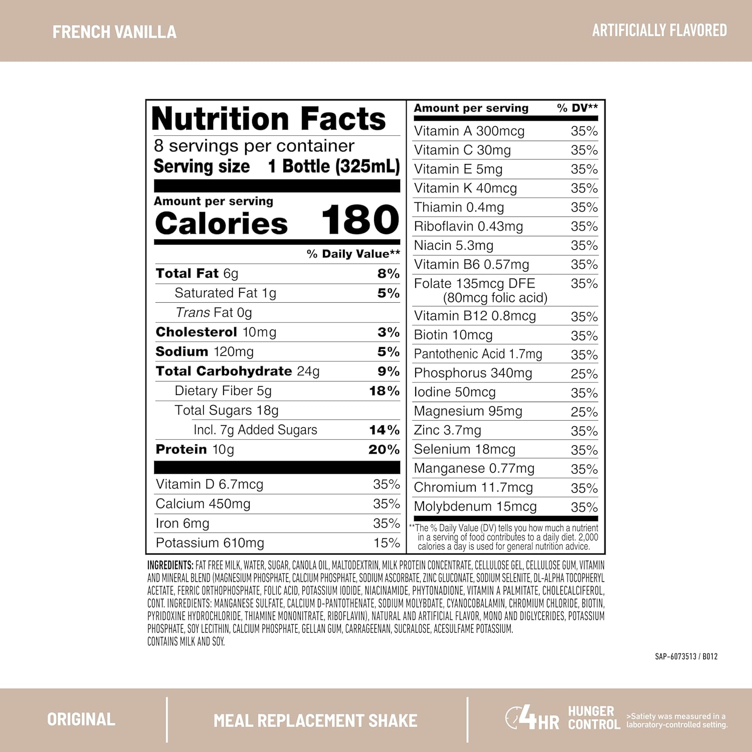 About this item A taste you'll love - Delightfully creamy French Vanilla flavor Created with your nutrition in mind by providing 24 vitamins and minerals like A, C, D, E and Zinc Each delicious shake provides up to four hours of hunger control to keep you on track Each SlimFast Original Shake provides 10g of protein, 5g of fiber and only 180 calories *Not a low calorie food. See Nutrition Facts for saturated fat content. See more product details,A taste you'll love - Delightfully creamy French Vanilla flavor,Created with your nutrition in mind by providing 24 vitamins and minerals like A, C, D, E and Zinc,Each delicious shake provides up to four hours of hunger control to keep you on track,Each SlimFast Original Shake provides 10g of protein, 5g of fiber and only 180 calories,*Not a low calorie food. See Nutrition Facts for saturated fat content
