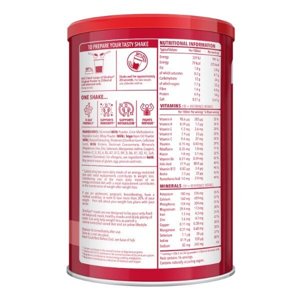 Product Information:Meal Replacement To Help Support Weight Management And Weight Loss 23 Vitamins &Amp; Minerals High In Protein Source Of Fibre 16 Servings,Features:Contains A Minimum Of 30% Ri For Your A-Z Vitamins And Minerals No Artificial Colours, Flavours Or Preservatives High In Protein To Help You To Maintain Muscle Includes 4G Of Fibre Per Serving,Warning Or Restrictions:If You Are Adolescent, Pregnant, Breastfeeding, Have A Medical Condition, Or Want To Lose More Than 20% Of Your Weight - Then Talk About Your Weight Loss Plans With Your Doctor. Slimfast Meals Are Not Designed To Be Your Only Food - Eat Balanced Meals, Healthy Snacks And Drink Plenty Of Water. Can Only Help Weight Loss As Part Of A Calorie-Controlled, Varied Diet And An Active Lifestyle,Product Specification:Skimmed Milk Powder, Maltodextrin, Inulin, Soya Bean Oil Powder (Milk), Natural Flavouring, Thickeners (Xanthan Gum, Sodium Carboxymethyl Cellulose), Vitamins &Amp; Minerals (Potassium Phosphate, Magnesium Oxide, Vitamin C, Vitamin E, Iron Pyrophosphate, Zinc Sulphate, Niacin, Vitamin A, Pantothenic Acid, Biotin, Manganese Sulphate, Vitamin B12, Potassium Iodide, Sodium Selenite, Folic Acid, Vitamin D, Copper Sulphate, Vitamin B6, Thiamin, Riboflavin, Vitamin K), Milk Protein, Colour (Beetroot Red), Salt, Sweetener (Sucralose),Product Uses:To Prepare Your Tasty Shake: Take 250Ml Of Cold Skimmed Milk Add 2 Level Scoops Of Powder To The Milk (Scoop In Tub) Shake Well For Approximately 20 Seconds For Best Results Use A Blender And Ice,Tips And Advice:To Be Used As Part Of The Slimfast 3.2.1. Plan: 3 100Kcal Slimfast Snacks A Day, Or Fruit &Amp; Veg 2 Tasty Slimfast Meal Bars Or Shakes 1 600Kcal Healthy Meal (800Kcal For Men) Drink At Least 2 Litres Of Water Get Active To Help You Reach Your Goal