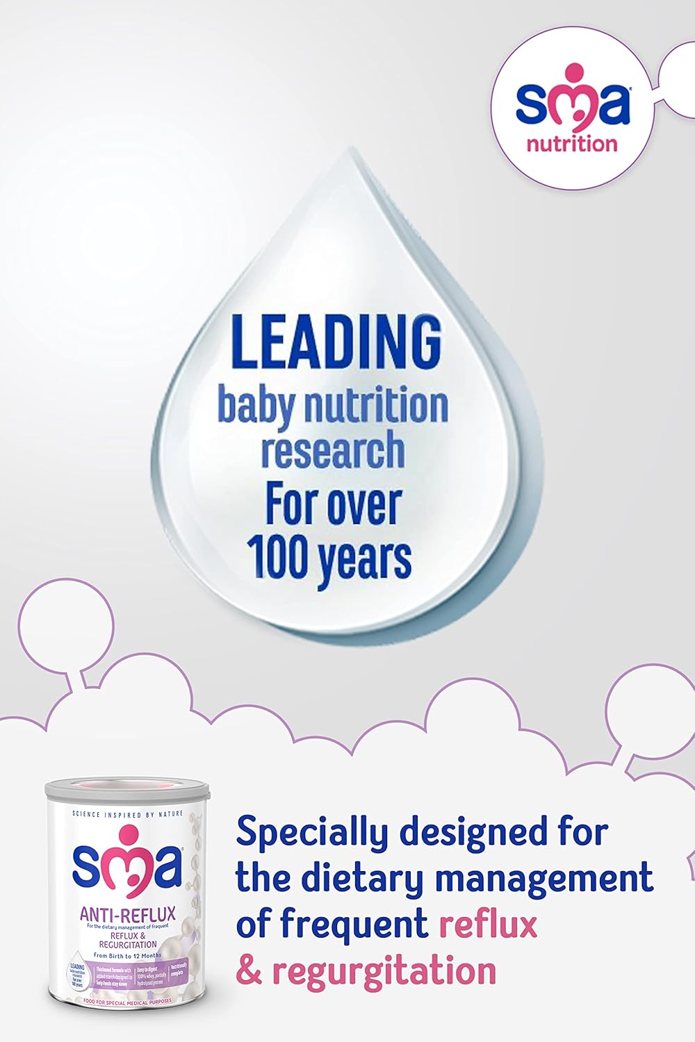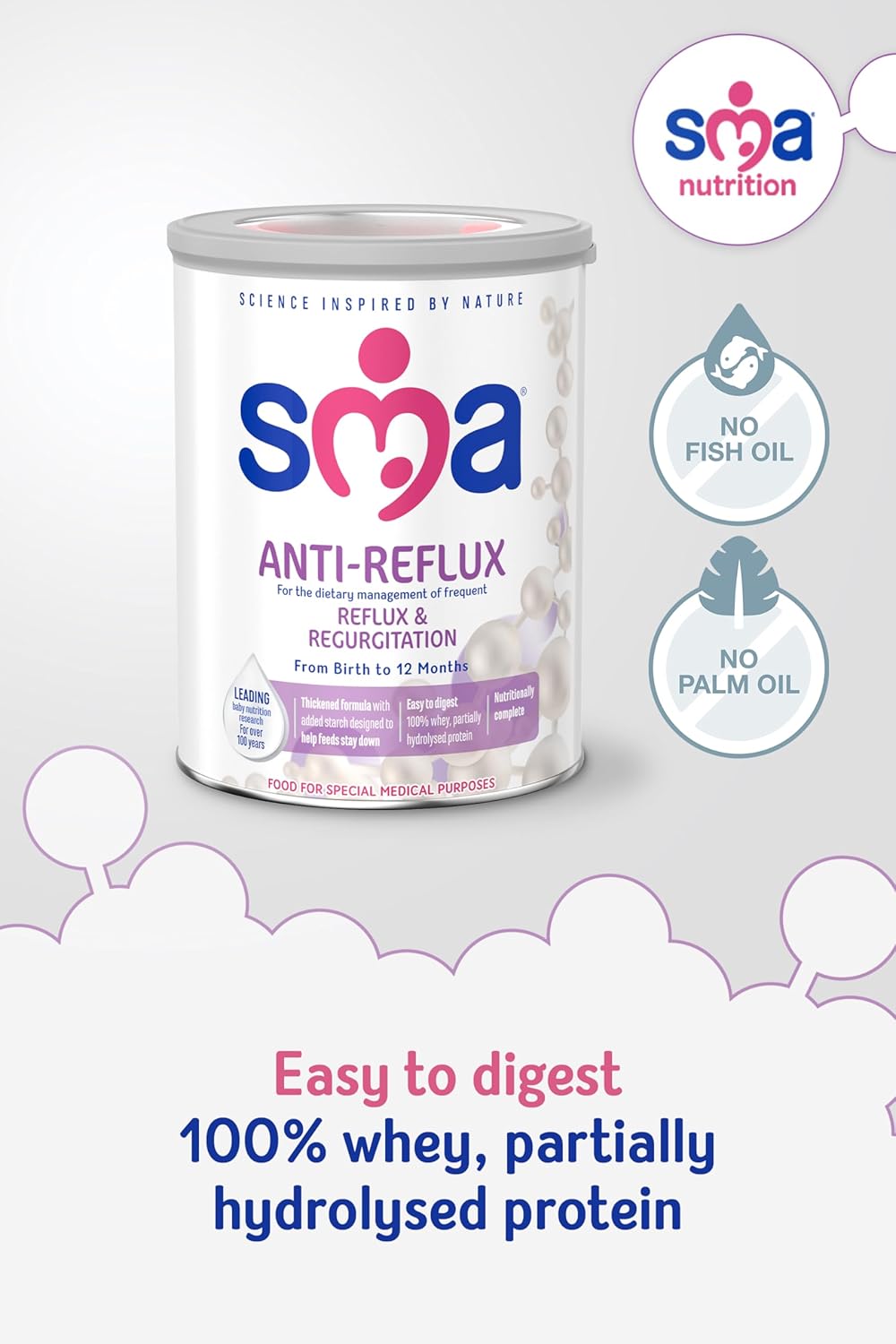 About this item The information below applies to each unit in the pack SMA Anti-Reflux Baby Milk Powder is specially designed for the dietary management of babies with frequent reflux (regurgitation/spitting up) Our SMA Anti-Reflux Baby Milk is nutritionally complete and can be used as the sole source of nutrition from birth Easy to digest blend our SMA Anti-Reflux formula milk contains a unique combination of starch and 100% Whey, partially hydrolysed protein SMA Anti-Reflux Baby Milk Powder is a thickened formula with added starch designed to help feeds stay down SMA Anti-reflux Baby Milk is a food for special medical purposes and must be used under medical supervision › See more product details,The information below applies to each unit in the pack,SMA Anti-Reflux Baby Milk Powder is specially designed for the dietary management of babies with frequent reflux (regurgitation/spitting up),Our SMA Anti-Reflux Baby Milk is nutritionally complete and can be used as the sole source of nutrition from birth,Easy to digest blend our SMA Anti-Reflux formula milk contains a unique combination of starch and 100% Whey, partially hydrolysed protein,SMA Anti-Reflux Baby Milk Powder is a thickened formula with added starch designed to help feeds stay down,SMA Anti-reflux Baby Milk is a food for special medical purposes and must be used under medical supervision