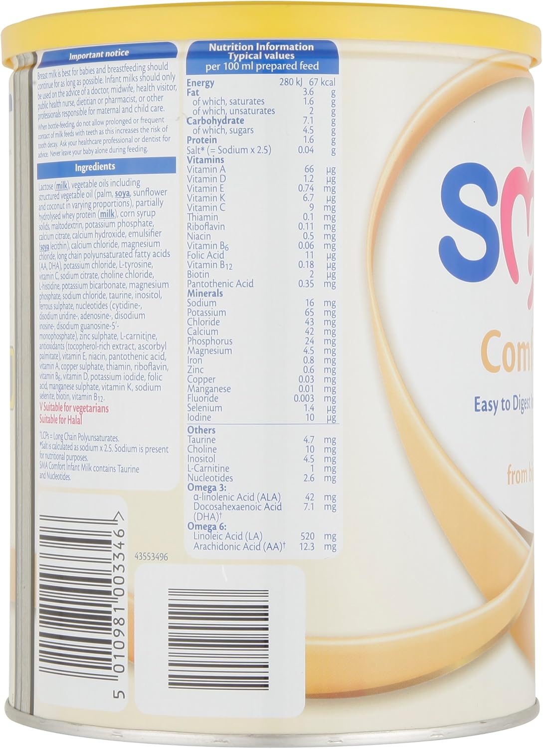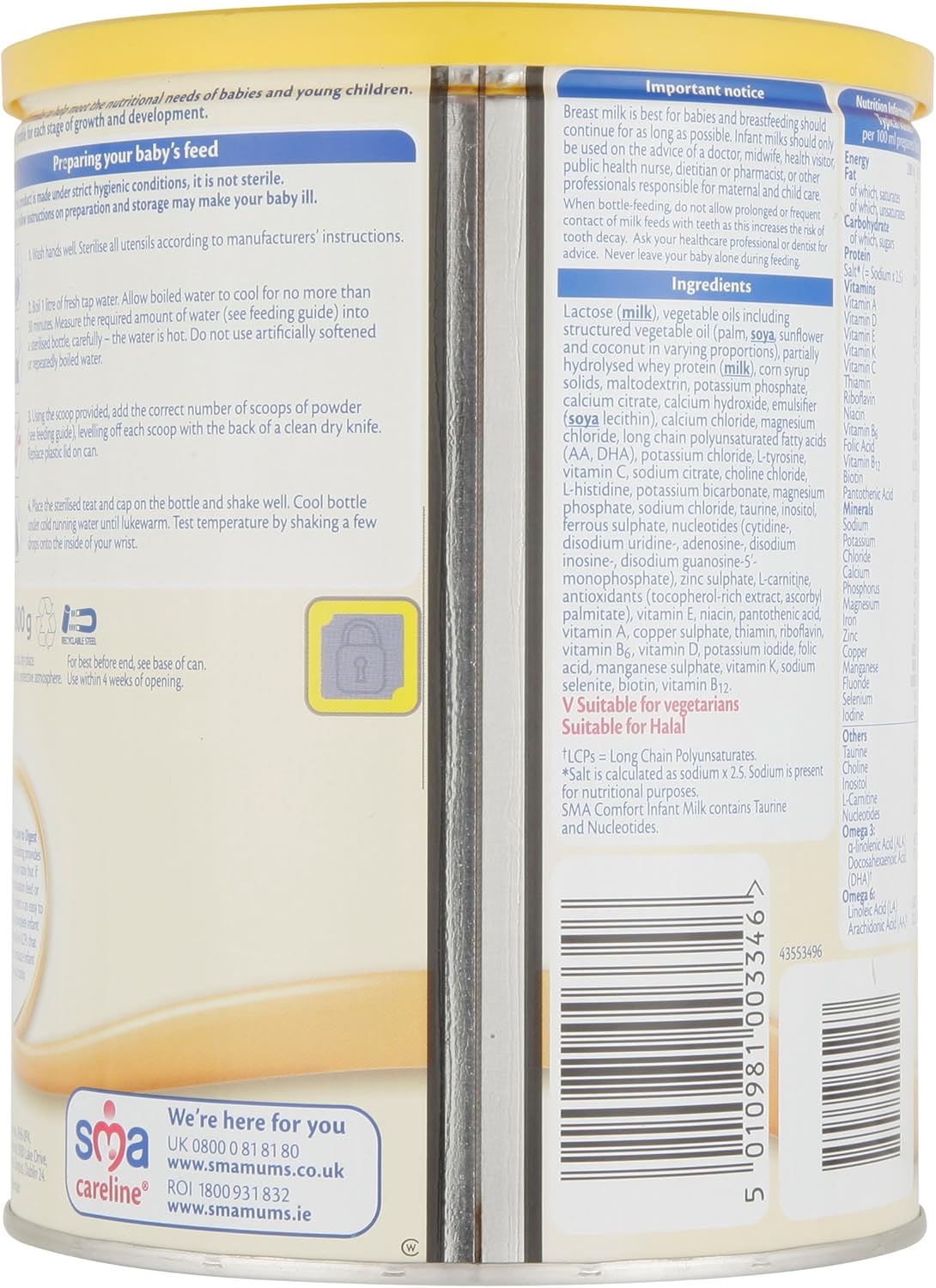 Product Description Product Description : SMA Nutrition Over the past 90 years, SMA Nutrition has invested in early life nutrition research. As a result, SMA PRO is born. Inspired by the specific needs of babies, SMA PRO represents some of SMA Nutrition's enhanced formulas yet. Nutritional foundation for life. Nutri-Steps is SMA's unique blend of ingredients tailored to support babies’ nutritional needs now and as they grow, every step of the way, including Iron to help support normal cognitive development, Vitamin D, Calcium, Omega 3 and 6 and GOS/FOS. Exclusive Protein Process: Made with SMA Nutrition’s unique protein technology. Cognition: With Iron to help support normal cognitive development. Development: With Vitamin D and Calcium to support the normal growth and development of bones. Growth: With Omega 3 and 6 to support normal growth and development. Also available in liquids. Packaged in a protected atmosphere. For further information, please refer to the product imagery. Important Notice Breast milk is best for babies and breastfeeding should continue for as long as possible. SMA PRO Follow-on Milk is only suitable for babies over 6 months as part of a mixed diet. It should not be used as a substitute for breast milk during the first 6 months. The decision to start weaning or to use this product before 6 months, should be made only on the advice of a doctor, midwife, health visitor, public health nurse, dietitian or pharmacist, based on baby’s individual needs. When bottle-feeding, do not allow prolonged or frequent contact of milk feeds with teeth as this increases the risk of tooth decay. Ask your healthcare professional or dentist for advice. Never leave your baby alone during feeding as there is a risk they might choke. Ingredients Lactose (MILK), Vegetable Oils including Structured Vegetable Oil (Palm, Soya, Sunflower and CocoNUT in varying proportions), Partially Hydrolysed Whey Protein (MILK), Corn Syrup Solids, Maltodextrin, Potassium Phosphate, Calcium Citrate, Calcium Hydroxide, Emulsifier (Soya Lecithin), Calcium Chloride, Magnesium Chloride, Long Chain Polyunsaturated Fatty Acids (AA, DHA), Potassium Chloride, L-Tyrosine, Vitamin C, Sodium Citrate, Choline Chloride, L-Histidine, Potassium Bicarbonate, Magnesium Phosphate, Sodium Chloride, Taurine, Inositol, Ferrous Sulphate, Nucleotides (Cytidine-, Disodium Uridine-, Adenosine-, Disodium Inosine-, Disodium Guanosine-5'-Monophosphate), Zinc Sulphate, L-Carnitine, Antioxidants (Tocopherol-Rich Extract, Ascorbyl Palmitate), Vitamin E, Niacin, Pantothenic Acid, Vitamin A, Copper Sulphate, Thiamin, Riboflavin, Vitamin B6, Vitamin D, Potassium Iodide, Folic Acid, Manganese Sulphate, Vitamin K, Sodium Selenite, Biotin, Vitamin B12 P.when('A').execute(function(A) { A.on('a:expander:toggle_description:toggle:collapse', function(data) { window.scroll(0, data.expander.$expander[0].offsetTop-100); }); }); Safety Warning Important notice: breast milk is best for babies and breastfeeding should continue for as long as possible. Infant milks are suitable from birth when babies are not breastfed and should only be used on the advice of a doctor, midwife, health visitor, public health nurse, dietitian or pharmacist, or other professionals responsible for maternal and child care. When bottle-feeding, do not allow prolonged or frequent contact of milk feeds with teeth as this increases the risk of tooth decay. Ask your healthcare professional or dentist for advice. Always hold your baby while feeding. Do not leave baby unattended as they might choke. Manufacturer Contact Information St Georges House Room A1621 Croydon Cr9 1Nr See more,Advanced Gold System is a range of scientifically developed formulas to help meet the nutritional needs of babies and young children,Increased alpha - protein which essential for healthy growth and development,Nutritionally complete,Breast milk substitute,Omega 3 & 6 LCPs,Suitable for vegetarians