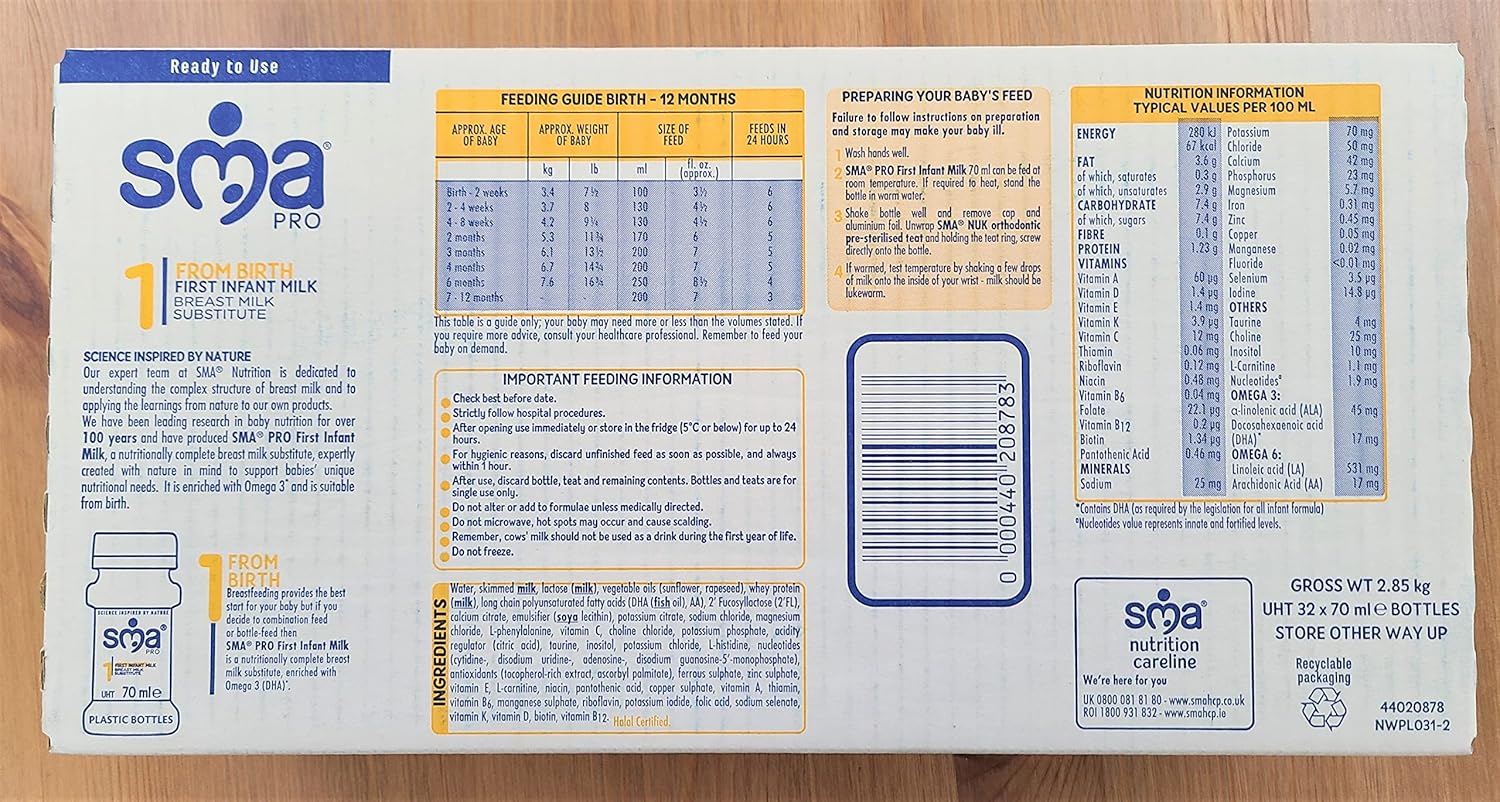 Sma Pro First Milk From Birth & Ready-To-Feed, 70Ml Bottles Cases Of 32 Bottles