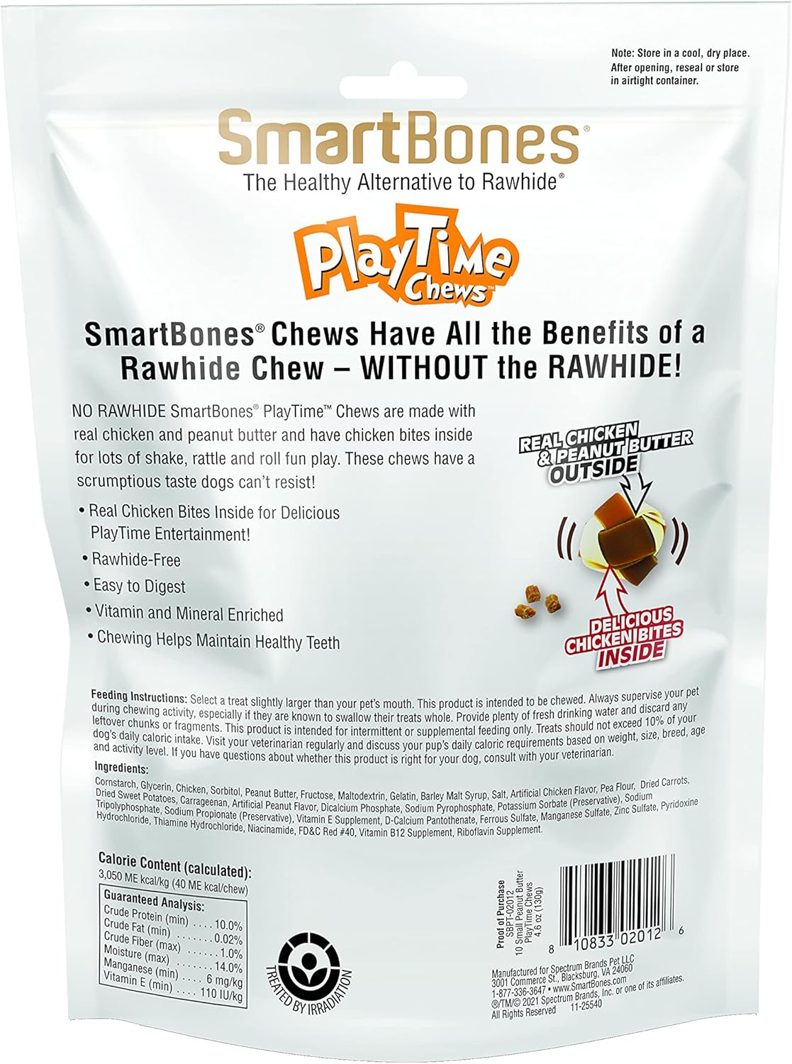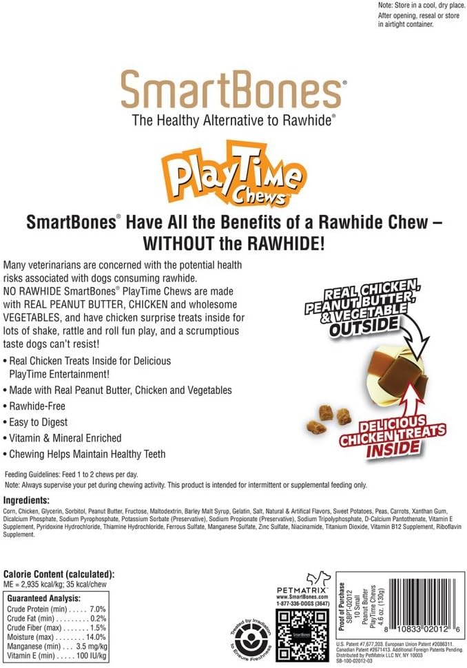 Smartbones Chews Have All The Benefits Of A Rawhide Chew…Without The Rawhide. No-Rawhide Smartbones Chews Are Made With Real Chicken, Beef, Bacon And Cheese Or Sweet Potato And Wholesome Vegetables For A Scrumptious Taste Dogs Can’T Resist.Smartbones Small Playtime Chews With Peanut Butter Are Made With Real Chicken And Wholesome Vegetables For A Scrumptious Taste Dogs Can’T Resist. Chicken Surprise Treats Inside Add Lots Of Shake, Rattle And Roll For Delicious Entertainment. These Fun Chews Have A Chicken, Peanut Butter And Vegetable Outside Wrapped Around Delectable Chicken Treats Inside. These Rawhide-Free Chews Are Vitamin And Mineral Enriched And Easy To Digest. Chewing Helps Maintain Healthy Teeth. Contains 10 Chews.We Know That Your Dog Is More Than A Pet – They’Re Family. That’S Why After Learning About The Concerns That Veterinarians And Pet Parents Have About Rawhide Chews, We Set Out To Create A Chew Alternative That Wasn’T Just Healthy, But Tasted Great — Two Simple Principles That Guided Our Development Team. Smartbones Brand Will Never Compromise On Quality. Our Quality Control Team Monitors Everything, Everywhere — Ingredients, Manufacturing Processes, Factory Equipment, Storage And Much More — To Make Sure That Smartbones Chews Are Made, Stored, And Shipped According To U.S. Food And Drug Administration (Fda) Standards In Facilities That Are Among The Most Modern In The World