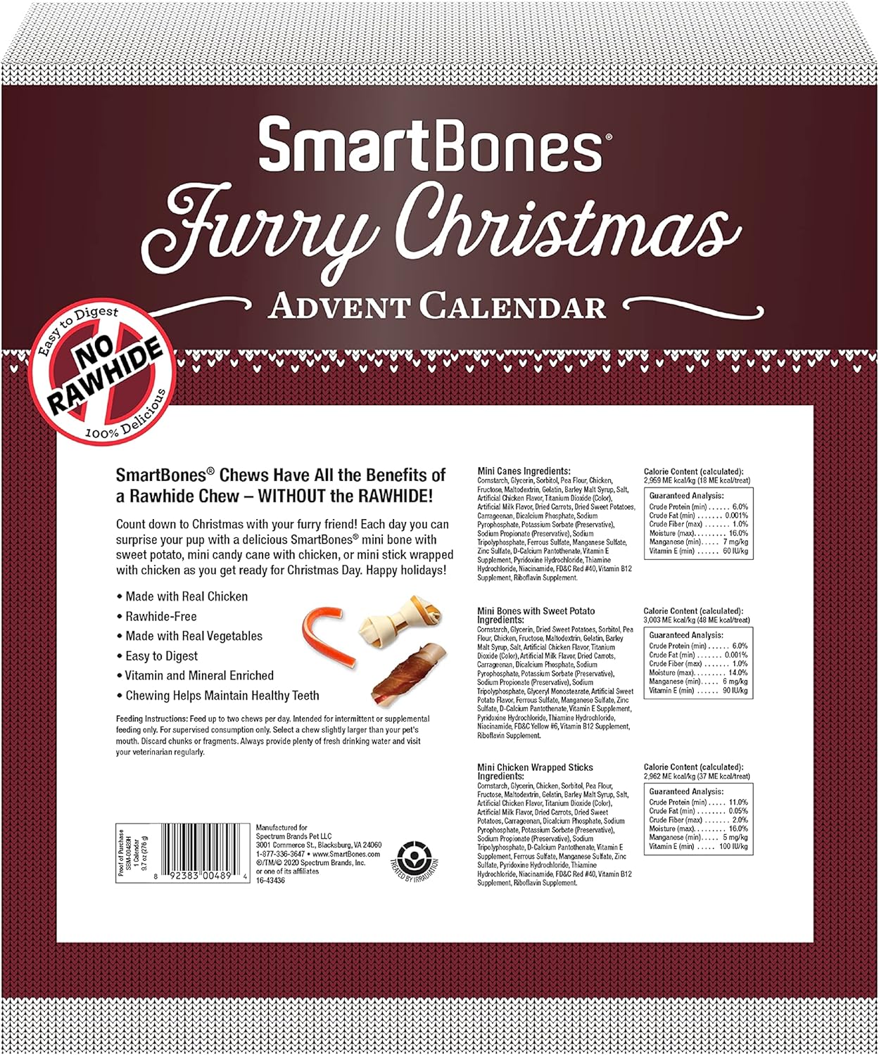 Smartbones Chews Have All The Benefits Of A Rawhide Chew Without The Rawhide. No-Rawhide Smartbones Chews Are Made With Real Chicken For A Scrumptious Taste Dogs Can’T Resist. Happy Holidays. Count Down To Christmas With Your Furry Friend. Each Day You Can Surprise Your Pup With A Delicious Smartbones Mini Bone With Sweet Potato, Mini Candy Cane With Chicken, Or Mini Stick Wrapped With Chicken As You Get Ready For Christmas Day. Made With Real Chicken, These Rawhide Free Chews Are Easy To Digest And Vitamin And Mineral Enriched For A Holiday Treat You Can Feel Good About Giving Your Pup. Chewing Helps Maintain Healthy Teeth. Contains 8 Of Each Shape For 24 Total Chews.Give Your Dog Up To Two Smartbones Chews Per Day. Always Supervise Your Pup During Chewing Activity And Provide Access To Fresh, Clean Water. These Chews Are Intended For Intermittent Or Supplemental Feeding Only. Store In A Cool, Dry Place. After Opening, Reseal Or Store In An Airtight Container To Preserve Freshness