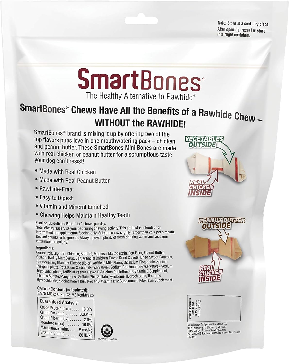 SmartbonesĀ® Chews Have All The Benefits Of A Rawhide Chewā¦Without The Rawhide. No-Rawhide Smartbones Chews Are Made With Real Chicken For A Scrumptious Taste Dogs CanāT Resist. Smartbones Brand Is Mixing It Up By Offering Two Of The Top Flavors Pups Love In One Mouthwatering Pack ā Chicken And Peanut Butter. These Smartbones Mini Bones Are Made With Real Chicken Or Peanut Butter For A Scrumptious Taste Your Dog CanāT Resist. A Healthy Alternative To Rawhide, These Rawhide-Free Chews Are Easy To Digest, Vitamin And Mineral Enriched And 100 Percent Delicious. Chewing Helps Maintain Healthy Teeth. Contains 32-Assorted Mini Chews Your Dog Will Love. Feed Your Dog 1 To 2 Chews Per Day. Always Supervise Your Pup During Chewing Activity. These Chews Are For Intermittent Or Supplemental Feeding Only. Select A Chew Slightly Larger Than Your PetāS Mouth. Store In A Cool, Dry Place. After Opening, Reseal Or Store In An Airtight Container To Preserve Freshness. Always Provide Plenty Of Fresh Drinking Water And Visit Your Veterinarian Regularly