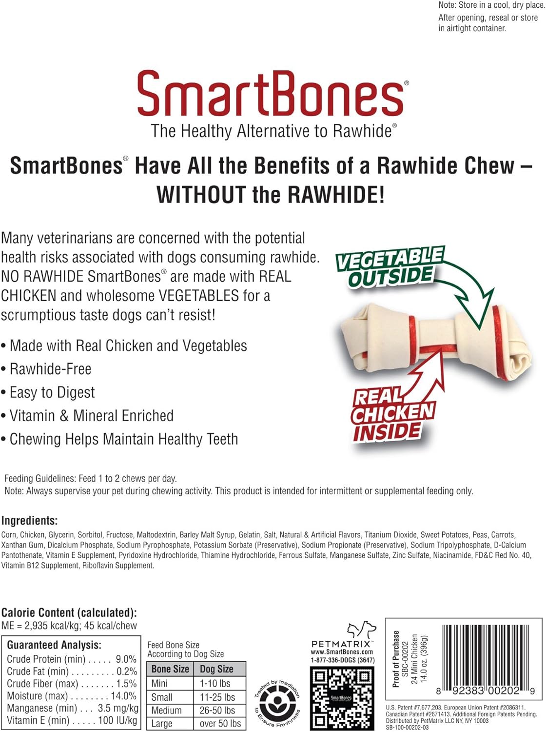 Smartbones Chews Have All The Benefits Of A Rawhide Chew…Without The Rawhide. No-Rawhide Smartbones Chews Are Made With Real Chicken, Beef, Bacon And Cheese Or Sweet Potato And Wholesome Vegetables For A Scrumptious Taste Dogs Can’T Resist. Smartbones Mini Chews With Real Chicken Are Made With Chicken And Wholesome Vegetables For A Scrumptious Taste Dogs Can’T Resist. These Bone-Shaped Treats Have A Vegetable Outside Wrapped Around Real Chicken Inside. These Rawhide-Free Chews Are Vitamin And Mineral Enriched And Easy To Digest. Chewing Helps Maintain Healthy Teeth. Contains 24 Chews. We Know That Your Dog Is More Than A Pet – They’Re Family. That’S Why After Learning About The Concerns That Veterinarians And Pet Parents Have About Rawhide Chews, We Set Out To Create A Chew Alternative That Wasn’T Just Healthy, But Tasted Great — Two Simple Principles That Guided Our Development Team. Smartbones Brand Will Never Compromise On Quality. Our Quality Control Team Monitors Everything, Everywhere — Ingredients, Manufacturing Processes, Factory Equipment, Storage And Much More — To Make Sure That Smartbones Chews Are Made, Stored, And Shipped According To U.S. Food And Drug Administration (Fda) Standards In Facilities That Are Among The Most Modern In The World
