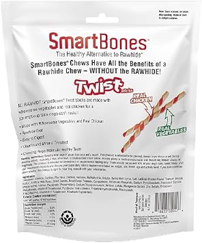 Rawhide-Free: Easy-To-Digest Dog Chews Made With Wholesome Ingredients10Real Chicken: Made With Real Chicken And Vegetables Twisted Together10Easy To Digest: Highly Digestible And 100% Delicious10Helps Maintain Healthy Teeth: Smartbones Chews Have All The Benefits Of A Rawhide Chew Without The Rawhide – Chewing Helps Maintain Healthy Teeth10Stick Shapes: 50 Twisted Stick-Shaped Chews Dogs Love10Smartbones Smart Twist Sticks With Peanut Butter Are Made With Real Chicken And Vegetables And Real Peanut Butter For A Scrumptious Taste Your Dog Can’T Resist! These Rawhide-Free Chews Are An Easy-To-Digest Alternative To Traditional Rawhide. Plus, They Are Vitamin- And Mineral-Enriched For A Treat You Both Can Feel Good About. Chewing Helps Maintain Healthy Teeth, So These Chews Are Both Engaging And Beneficial. Feed 1 To 2 Chews Per Day. Note: Always Supervise Your Pet During Chewing Activity. This Product Is Intended For Intermittent Or Supplemental Feeding Only. Select A Chew Slightly Larger Than Your Pet’S Mouth. Discard Leftover Chunks Or Fragments. Always Provide Fresh Drinking Water And Visit Your Veterinarian Regularly