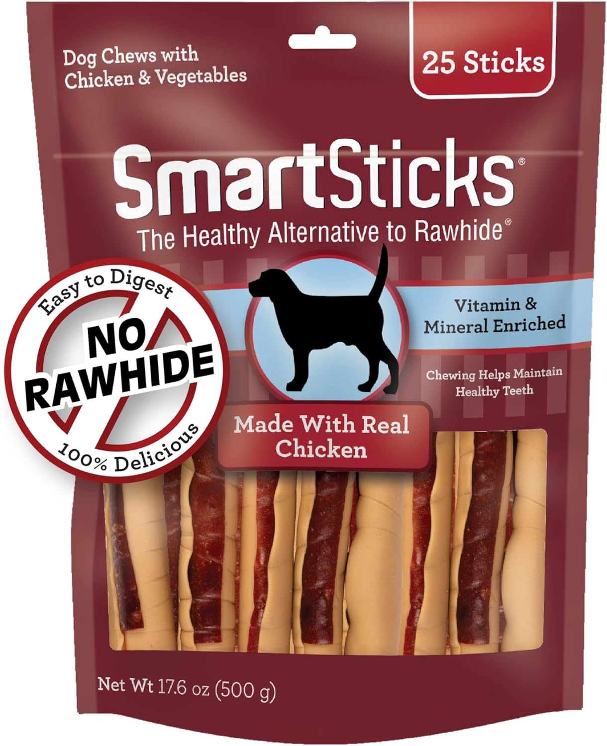 SmartbonesĀ® Chews Have All The Benefits Of A Rawhide Chewā¦Without The Rawhide. No-Rawhide Smartbones Chews Are Made With Real Chicken And Vegetables For A Scrumptious Taste Dogs CanāT Resist. These SmartsticksĀ® Chews Are Made With Real Chicken And Wholesome Vegetables For A Scrumptious Taste Dogs CanāT Resist. A Healthy Alternative To Rawhide, These Chews Are Easy To Digest And 100 Percent Delicious. Giving Your Dog A Treat That You Both Love Just Got A Whole Lot Easier. Smartsticks Chews Provide Great Taste In A Stick-Shaped Treat For Both Fun And Flavor. These Smartsticks Rawhide-Free Chews Are Vitamin And Mineral Enriched. Chewing Helps Maintain Healthy Teeth. Contains 25 Stick Chews Your Dog Will Love. Feed Your Dog 1 To 2 Chews Per Day. Always Supervise Your Pup During Chewing Activity. These Chews Are For Intermittent Or Supplemental Feeding Only. Select A Chew Slightly Larger Than Your PetāS Mouth. Store In A Cool, Dry Place. After Opening, Reseal Or Store In An Airtight Container To Preserve Freshness. Always Provide Plenty Of Fresh Drinking Water And Visit Your Veterinarian Regularly