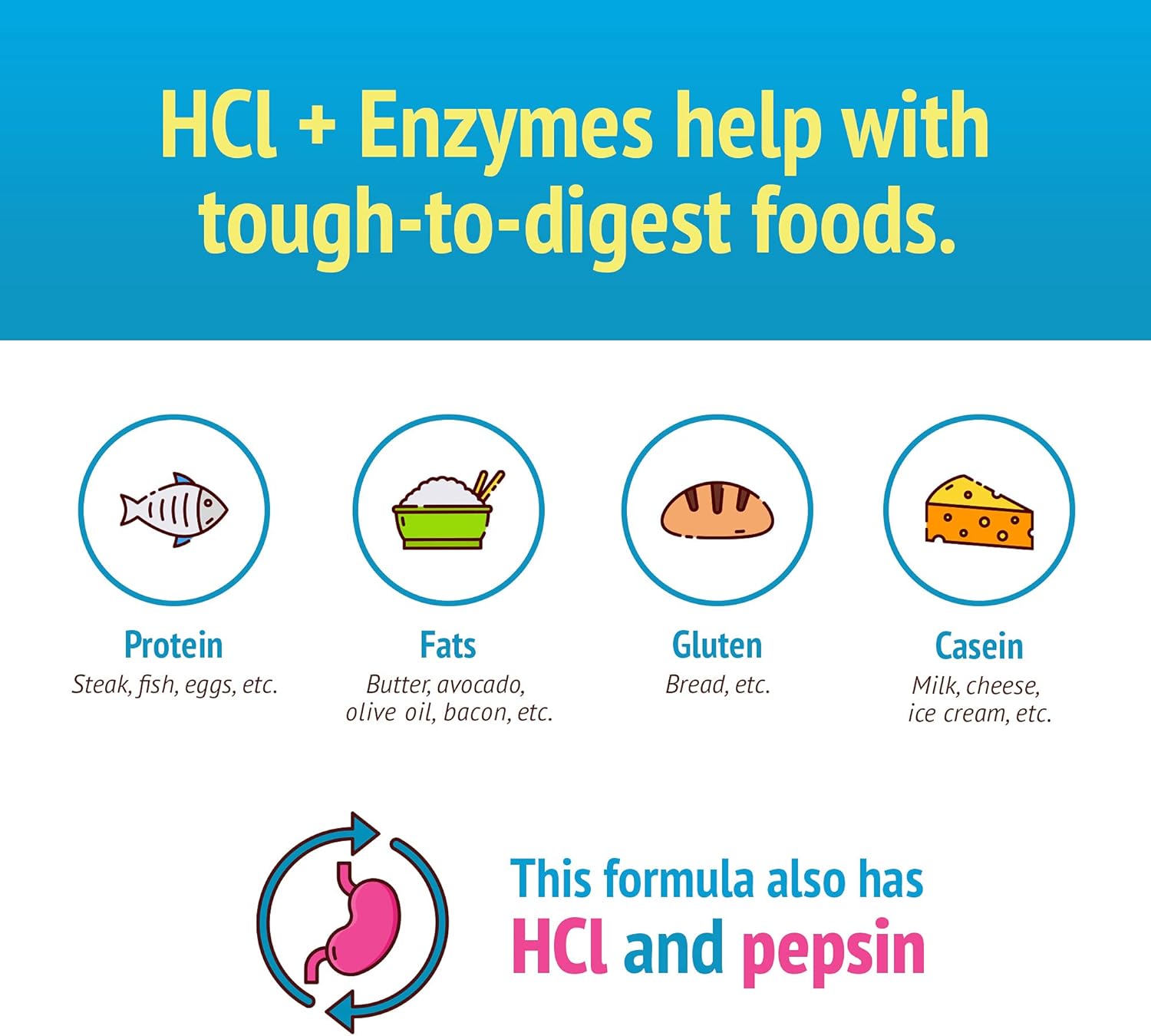 Ease bloating, gas, acid reflux before eating* – Combines a balanced dose of HCl and pepsin with vital enzymes that support stomach acid production and help digest food comfortably