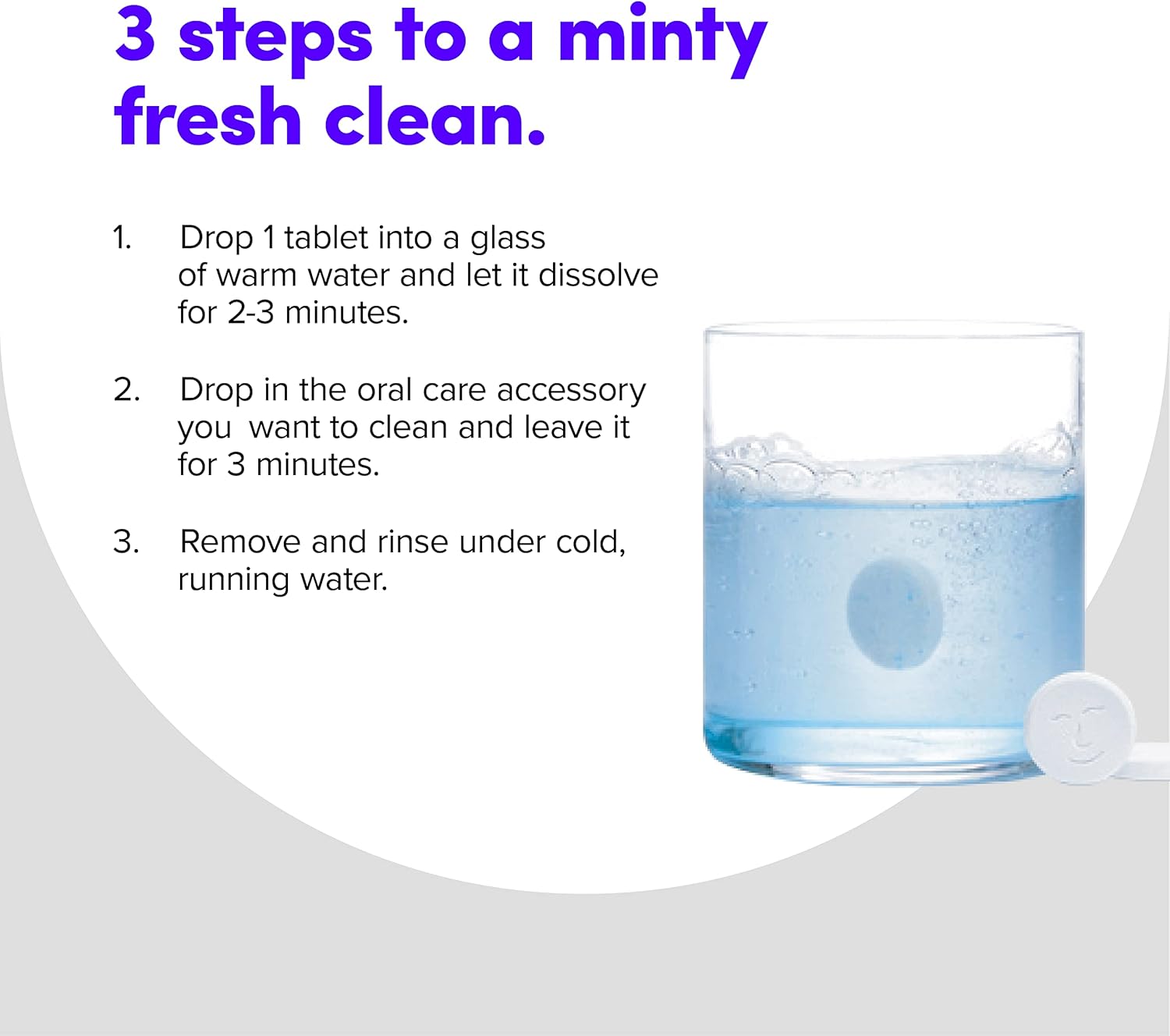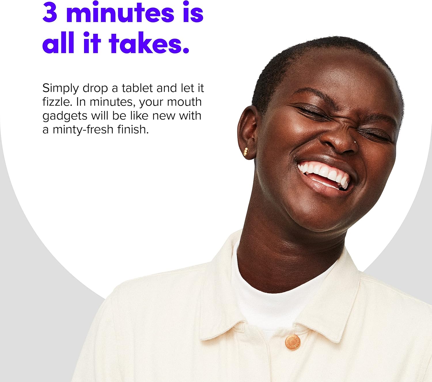 About this item Universal cleaning tablets sagely clean and brighten clear aligners, retainers, mouth guards, dentures, and more. Safe for daily use. Works within the first 3 minutes. Fresh mint flabor Step 1: Drop 1 retainer cleaning tablet into a glass of warm water (not too hot) - enough to cover whatever you're cleaning. Step 2: Let the aligner cleaner dissolve for 2-3 minutes. Then, drop in the thing you're cleaning and leave it for 3 minutes. Step 3: Remove it and rinse under cold, running water. Discard the remaining solution. See more product details,Universal cleaning tablets sagely clean and brighten clear aligners, retainers, mouth guards, dentures, and more,Safe for daily use. Works within the first 3 minutes. Fresh mint flabor,Step 1: Drop 1 retainer cleaning tablet into a glass of warm water (not too hot) - enough to cover whatever you're cleaning,Step 2: Let the aligner cleaner dissolve for 2-3 minutes. Then, drop in the thing you're cleaning and leave it for 3 minutes,Step 3: Remove it and rinse under cold, running water. Discard the remaining solution