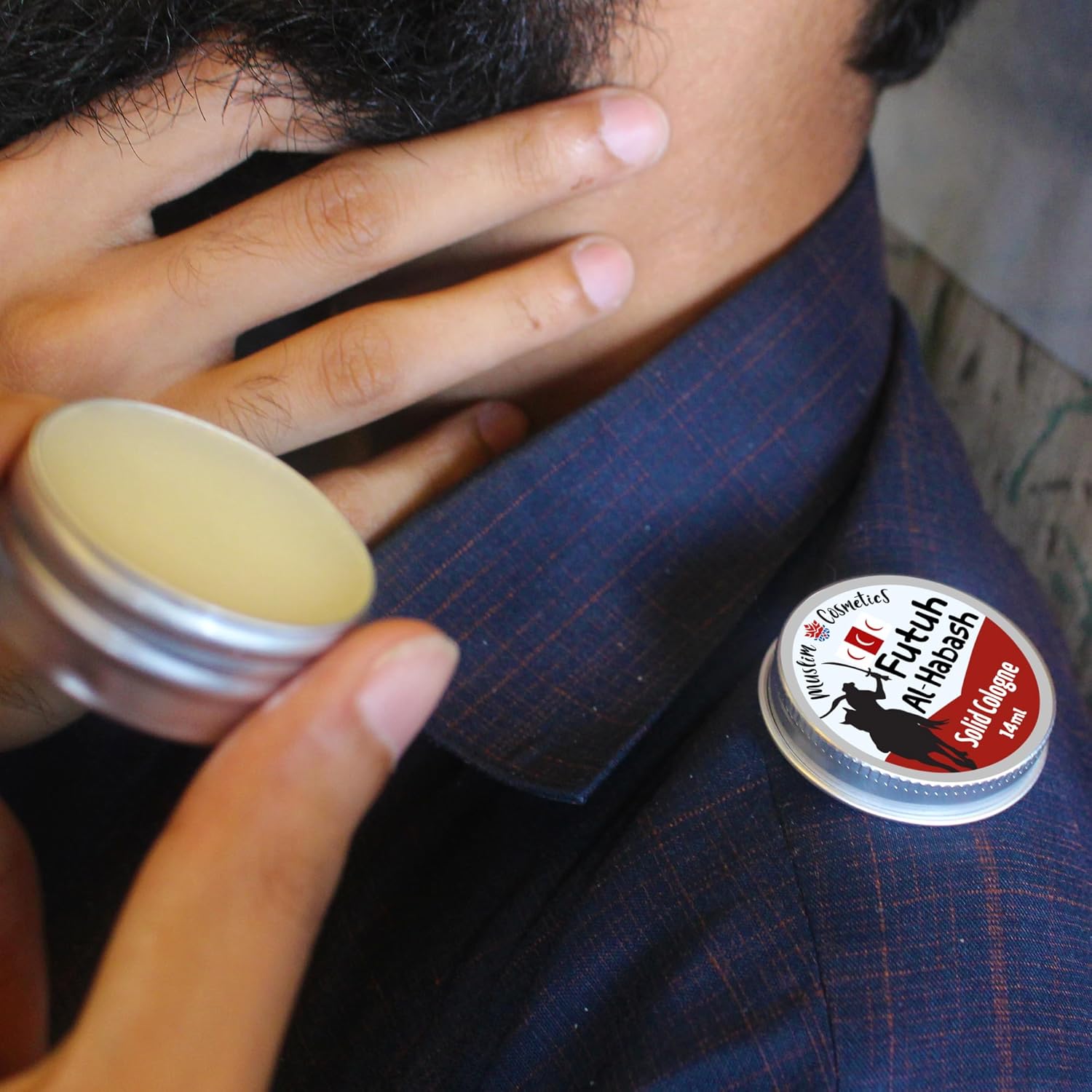 Futuh Al-Habash solid cologne combines the smoky richness of charred vanilla with amberous Frankincense Frereana. With smooth hints of Sandalwood, Birch and Tonka bean. Frereana is native to Somalia, highly prized and often referred to as the "King of Frankincense," making it the perfect foundation for this captivating scent. CULTURALLY INFLUENCED by the historic battle from 1529 to 1543, Futuh Al Habash, meaning "Conquest of Abyssinia," represents the conflict between the Adel Sultanate (pre-Somalia) and the Christian Abyssinians (pre-Ethiopia). This battle was a turning point that facilitated the spread of Islam into Ethiopia. The flag of the Adel Sultanate is proudly displayed on the cologne’s label, and Frankincense Frereana, an invasive species in Ethiopia, further ties this product to the historical roots of Islam and Frereana Frankincenses arrival in the region. DISCREET cologne is made to be discovered by those who come close to you. Solid cologne is a perfect solution for fragrance-free workplaces or schools where sprays aren’t allowed. With its compact, liquid-free format, there’s no risk of spills or confiscation, making it an ideal travel companion. You can refresh your scent discreetly at any time without others noticing. CONCENTRATED cologne balm is crafted to be a lasting investment. While the 14ml jar may appear to be small, the ratio of perfume oils is very concentrated compared to traditional liquid colognes. Solid cologne is intended to last a long time, as only a small amount is required with each use. TOUCH ACTIVATED formulation allows for easy transfer of the oils by gently rubbing your finger in a circular motion across the surface of the balm. This will melt the wax slightly, releasing the fragrance. The Jojoba wax encapsulates the perfume oils in a solid form, preventing the scent from evaporating. PRESERVATIVE FREE formula. This oil-based perfume will never spoil due to the absence of liquid. Over time, you may notice white, snowflake-like patterns on the balm due to the natural crystallization of Jojoba wax and Shea butter. This crystallization is a natural occurrence in cosmetic butters and does not affect the product's quality or indicate age,INGREDIENTS: Safflower oil / Jojoba wax / Shea butter / Somalian Frankincense Frereana Essential oil / Fragrance oil / Vanilla Essential oil / Sandalwood Essential oil / Tonka bean extract / Birch essential oil,Travel friendly | Compact size | Easy to carry | Liquid free,Handmade in London, Ontario Canada,Vegan friendly | Halal | No animal testing | No preservatives or synthetic dyes,Futuh Al Habash cologne is a unique solid fragrance balm inspired by the scent of Somalia