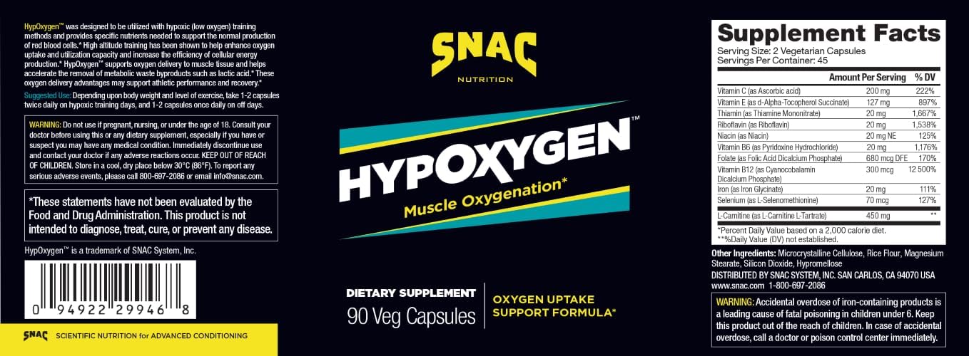 Snac Hypoxygen - Muscle Oxygenation Performance & Endurance Supplement, Improves The Body’S Vo2 Max & Assists With Recovery From High-Repetition Exercise, 90 Veggie Capsules (45 Servings)