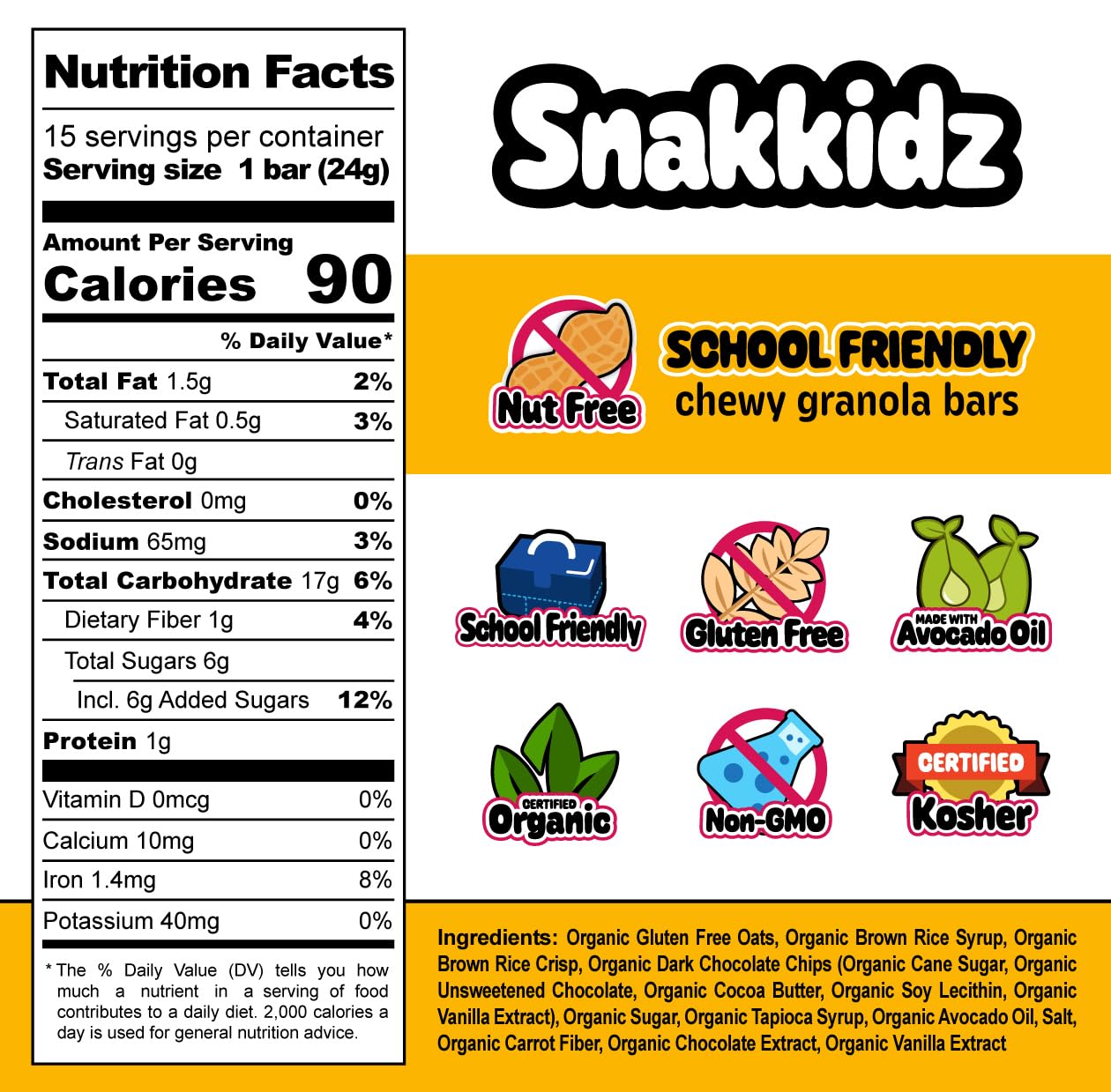 The Snakkidz Organic Chocolate Chip Granola Bar Is The Perfect Snack For The Health Conscious And Allergy-Friendly Family! Our Bars Are Low In Sugar, Made With Avocado Oil, And Nut Free - To Make Sure That School-Safe Snacks Can Be Enjoyed By Everyone. Parents Can Rest Easy Knowing That This Snack Is Made With 100% Natural Ingredients And Is Free Of Any Artificial Colors, Flavors Or Preservatives. Plus, With Great Taste Kids Will Love, They’Ll Be Asking For More! Not Only Are These Bars Healthy, But They’Re Also Fun! So, If You’Re Looking For A Snack That’S Both Delicious And Wholesome, The Snakkidz Chocolate Chip Granola Bar Is The Perfect Choice!