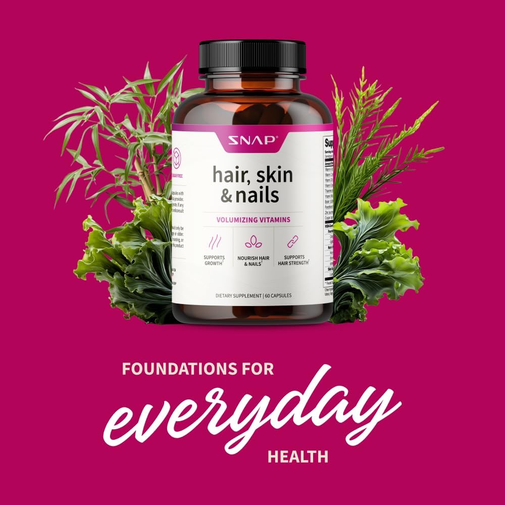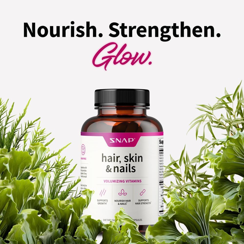 Snap Supplements Hair, Skin And Nails Vitamins, Support Hair Growth, Nourish Skin And Nails With Biotin, Collagen, Kelp, Bamboo And Other Vitamins, Radiant Skin, Strong Hair And Nails, 60 Capsules