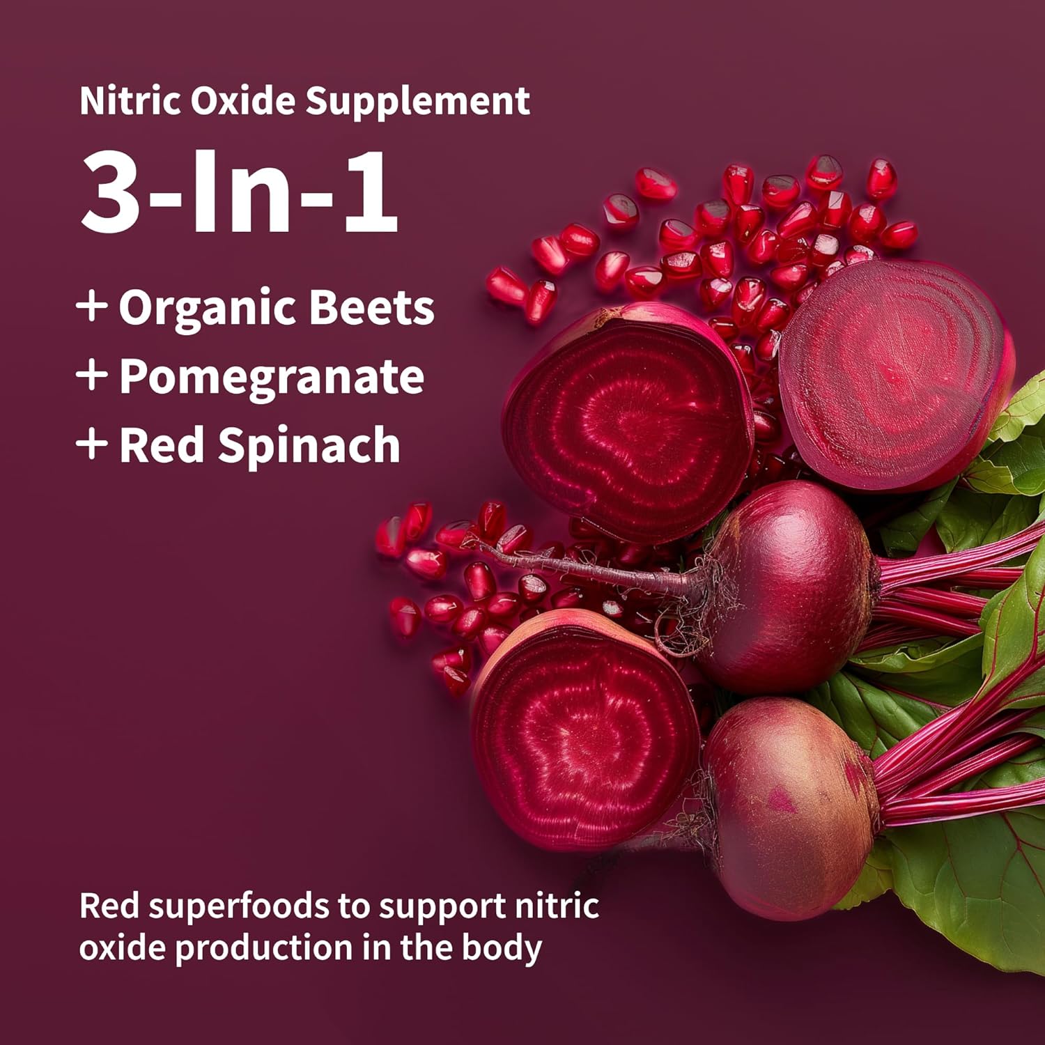 USDA Organic Beet Powder: Packed with nitrates, vitamins and micronutrients that help with all things pertaining to cardio healthSupport Healthy Blood PressureSupport Heart Health and Blood FlowPromotes Natural Energy and Stamina3-in-1 Nitric Oxide Booster Supplement: Beetroot, Pomegranate, Red Spinach. Red superfoods to support nitric oxide production in the body