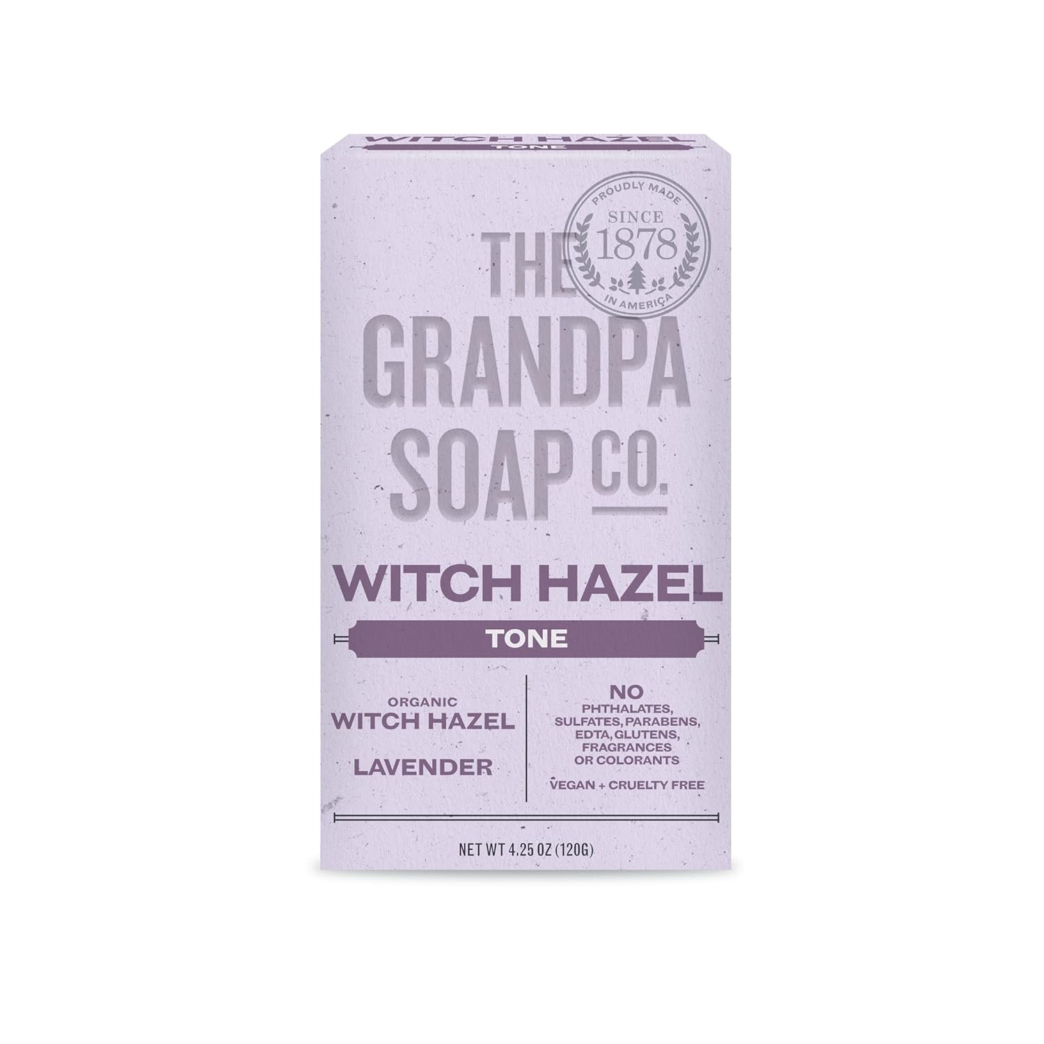 About this item WITCH HAZEL BAR SOAP The astringent property of organic witch hazel is enhanced by relaxing lavender in a mild formula that gently tones and rejuvenates. Witch Hazel Bar Soap is the soap of choice after a long day’s work – made from ingredients that work as hard as you do. PROPERTIES & BENEFITS Organic witch hazel contains many natural compounds which can help shrink your pores, soothe your skin, reduce skin redness and reduce inflammation. Combined with lavender, our Witch Hazel Soap will leave you with toned, clear and revitalized skin. NATURAL BODY SOAP Ideal for use as part of your daily hygiene routine, our natural Witch Hazel Bar Soap cleanses, invigorates, and freshens your face and body. The soap is designed to lather when applied to wet skin for a gentle clean. It rinses away, leaving skin and pores fresh and clean. PREMIUM INGREDIENTS Hardworking, simple, pure ingredients are at the heart of our natural soap-making tradition. Our natural Witch Hazel Bar Soap is made using a vegan and cruelty-free formula, free of phthalates, sulfates, parabens, EDTA, gluten, animal by-products, fragrances or colorants. FROM OUR FAMILY TO YOURS The Grandpa Soap Company is family owned and operated. Our family and its employees stand behind the quality of our products and believe in our traditions. See more product details,WITCH HAZEL BAR SOAP The astringent property of organic witch hazel is enhanced by relaxing lavender in a mild formula that gently tones and rejuvenates. Witch Hazel Bar Soap is the soap of choice after a long day’s work – made from ingredients that work as hard as you do,PROPERTIES & BENEFITS Organic witch hazel contains many natural compounds which can help shrink your pores, soothe your skin, reduce skin redness and reduce inflammation. Combined with lavender, our Witch Hazel Soap will leave you with toned, clear and revitalized skin,NATURAL BODY SOAP Ideal for use as part of your daily hygiene routine, our natural Witch Hazel Bar Soap cleanses, invigorates, and freshens your face and body. The soap is designed to lather when applied to wet skin for a gentle clean. It rinses away, leaving skin and pores fresh and clean,PREMIUM INGREDIENTS Hardworking, simple, pure ingredients are at the heart of our natural soap-making tradition. Our natural Witch Hazel Bar Soap is made using a vegan and cruelty-free formula, free of phthalates, sulfates, parabens, EDTA, gluten, animal by-products, fragrances or colorants,FROM OUR FAMILY TO YOURS The Grandpa Soap Company is family owned and operated. Our family and its employees stand behind the quality of our products and believe in our traditions