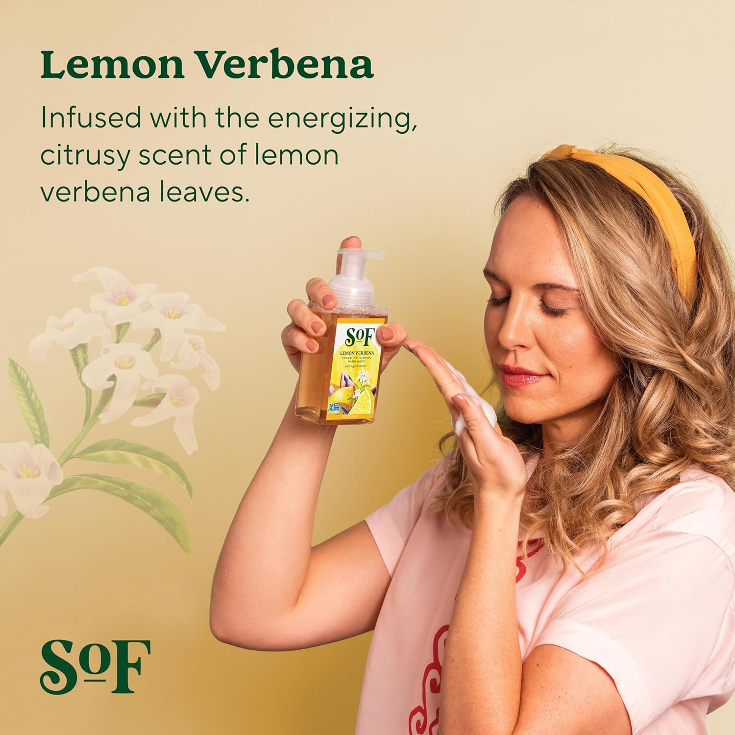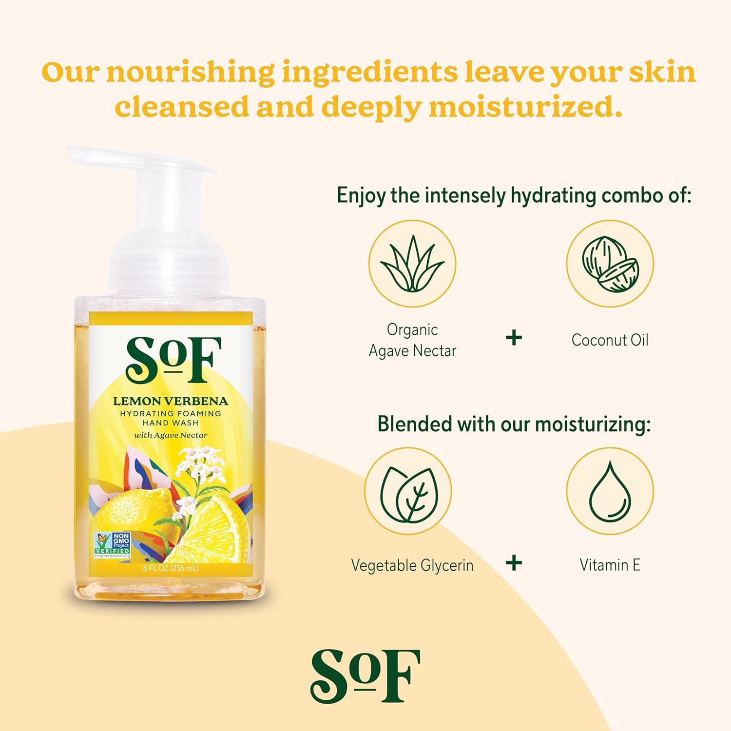 About this item HYDRATING FOAMING HAND WASH: Youâll never rush through a hand wash again. SoF foaming hand wash creates a luxurious lather so hands feel refreshed and replenished. MOISTURE-ENHANCING INGREDIENTS:Made with organic agave nectar, coconut oil and glycerin to leave your skin gently cleansed and moisturized. BRIGHT & CITRUSY: Our Lemon Verbena Foaming Hand Wash is infused with energizing lemon, lime, and herbal notes making you imagine sipping lemony drinks by the pool at a friend's sun-drenched beach house. NON GMO CERTIFIED AND VEGAN: Our foaming hand wash is certified Vegan and Cruelty Free and is Non GMO Project Verified. It is also Free from Phthalates, Sulfates, Parabens, EDTA and Glutens. WOMEN OWNED SoF is owned and operated by two sisters turned CEO-moms and made in America. Our family and its employees stand behind the quality of our products and believe in our traditions. See more product details,HYDRATING FOAMING HAND WASH: Youâll never rush through a hand wash again. SoF foaming hand wash creates a luxurious lather so hands feel refreshed and replenished,MOISTURE-ENHANCING INGREDIENTS:Made with organic agave nectar, coconut oil and glycerin to leave your skin gently cleansed and moisturized,BRIGHT & CITRUSY: Our Lemon Verbena Foaming Hand Wash is infused with energizing lemon, lime, and herbal notes making you imagine sipping lemony drinks by the pool at a friend's sun-drenched beach house,NON GMO CERTIFIED AND VEGAN: Our foaming hand wash is certified Vegan and Cruelty Free and is Non GMO Project Verified. It is also Free from Phthalates, Sulfates, Parabens, EDTA and Glutens,WOMEN OWNED SoF is owned and operated by two sisters turned CEO-moms and made in America. Our family and its employees stand behind the quality of our products and believe in our traditions