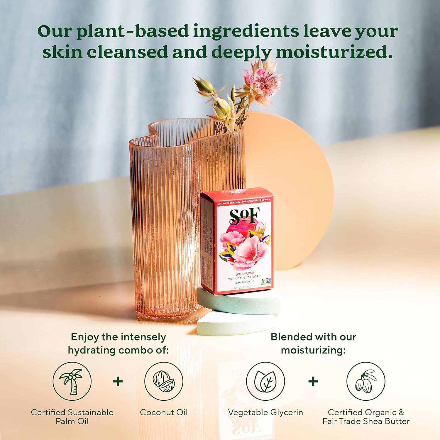 About this item CREAMY AND HYDRATING BAR SOAP: Our long-lasting, signature bar soap is triple milled with coconut oil and sustainable palm oil, creating a creamy lather for an uplifting cleansing experience. Organic and Fair Trade Certified shea butter leaves skin soft, moisturized and happy. FRAGRANCES TO LIVE BY: Our bar soaps are designed with unique, layered scents made up of natural essential oils and fragrance FRESH & FLORAL: Our Fresh Violet Bar Soap is infused with fresh violet blooms, iris, and woody notes sparking thoughts of freshly picked wild violets on a windowsill, their velvety sweetness drifting in on a gentle breeze. NON GMO CERTIFIED AND VEGAN: Our bar soap is certified Vegan and Cruelty Free and is Non GMO Project Verified. It is also Free from Phthalates, Sulfates, Parabens, EDTA and Glutens. WOMEN OWNED SoF is owned and operated by two sisters turned CEO-moms and made in America. Our family and its employees stand behind the quality of our products and believe in our traditions. See more product details,CREAMY AND HYDRATING BAR SOAP: Our long-lasting, signature bar soap is triple milled with coconut oil and sustainable palm oil, creating a creamy lather for an uplifting cleansing experience. Organic and Fair Trade Certified shea butter leaves skin soft, moisturized and happy,FRAGRANCES TO LIVE BY: Our bar soaps are designed with unique, layered scents made up of natural essential oils and fragrance,FRESH & FLORAL: Our Fresh Violet Bar Soap is infused with fresh violet blooms, iris, and woody notes sparking thoughts of freshly picked wild violets on a windowsill, their velvety sweetness drifting in on a gentle breeze,NON GMO CERTIFIED AND VEGAN: Our bar soap is certified Vegan and Cruelty Free and is Non GMO Project Verified. It is also Free from Phthalates, Sulfates, Parabens, EDTA and Glutens,WOMEN OWNED SoF is owned and operated by two sisters turned CEO-moms and made in America. Our family and its employees stand behind the quality of our products and believe in our traditions
