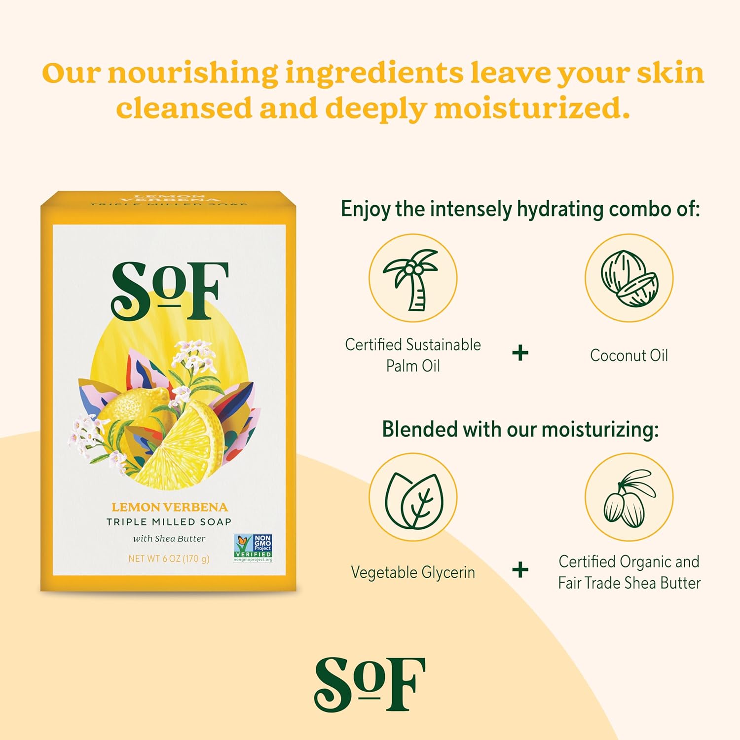 About this item CREAMY AND HYDRATING BAR SOAP: Our long-lasting, signature bar soap is triple milled with coconut oil and sustainable palm oil, creating a creamy lather for an uplifting cleansing experience. Organic and Fair Trade Certified shea butter leaves skin soft, moisturized and happy. FRAGRANCES TO LIVE BY: Our bar soaps are designed with unique, layered scents made up of essential oils and fragrance. BRIGHT & CITRUSY: Our Lemon Verbena Bar Soap is infused with energizing lemon, lime and herbal notes making you imagine sipping lemony drinks by the pool at a friendās sun-drenched beach house. NON GMO CERTIFIED AND VEGAN: Our bar soap is certified Vegan and Cruelty Free and is Non GMO Project Verified. It is also Free from Phthalates, Sulfates, Parabens, EDTA and Glutens. WOMEN OWNED SoF is owned and operated by two sisters turned CEO-moms and made in America. Our family and its employees stand behind the quality of our products and believe in our traditions. See more product details,CREAMY AND HYDRATING BAR SOAP: Our long-lasting, signature bar soap is triple milled with coconut oil and sustainable palm oil, creating a creamy lather for an uplifting cleansing experience. Organic and Fair Trade Certified shea butter leaves skin soft, moisturized and happy,FRAGRANCES TO LIVE BY: Our bar soaps are designed with unique, layered scents made up of essential oils and fragrance,BRIGHT & CITRUSY: Our Lemon Verbena Bar Soap is infused with energizing lemon, lime and herbal notes making you imagine sipping lemony drinks by the pool at a friendās sun-drenched beach house,NON GMO CERTIFIED AND VEGAN: Our bar soap is certified Vegan and Cruelty Free and is Non GMO Project Verified. It is also Free from Phthalates, Sulfates, Parabens, EDTA and Glutens,WOMEN OWNED SoF is owned and operated by two sisters turned CEO-moms and made in America. Our family and its employees stand behind the quality of our products and believe in our traditions