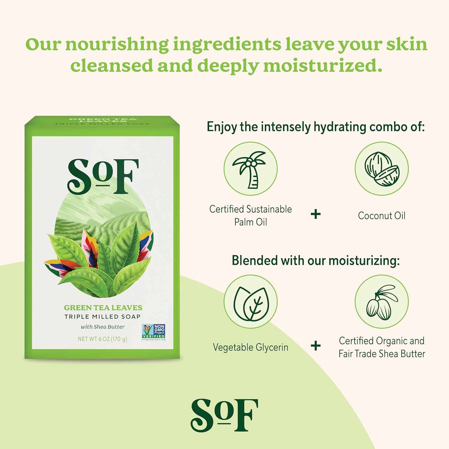 About this item CREAMY AND HYDRATING BAR SOAP: Our long-lasting, signature bar soap is triple milled with coconut oil and sustainable palm oil, creating a creamy lather for an uplifting cleansing experience. Organic and Fair Trade Certified shea butter leaves skin soft, moisturized and happy. FRAGRANCES TO LIVE BY: Our bar soaps are designed with unique, layered scents made up of natural essential oils and fragrance. SERENE & SOPHISTICATED: Our Shea Butter Bar Soap is infused with shea butter, coconut, and citrus making you imagine the warm aroma of a carefree summer day. NON GMO CERTIFIED AND VEGAN: Our bar soap is certified Vegan and Cruelty Free and is Non GMO Project Verified. It is also Free from Phthalates, Sulfates, Parabens, EDTA and Glutens. WOMEN OWNED SoF is owned and operated by two sisters turned CEO-moms and made in America. Our family and its employees stand behind the quality of our products and believe in our traditions. See more product details,CREAMY AND HYDRATING BAR SOAP: Our long-lasting, signature bar soap is triple milled with coconut oil and sustainable palm oil, creating a creamy lather for an uplifting cleansing experience. Organic and Fair Trade Certified shea butter leaves skin soft, moisturized and happy,FRAGRANCES TO LIVE BY: Our bar soaps are designed with unique, layered scents made up of natural essential oils and fragrance,SERENE & SOPHISTICATED: Our Shea Butter Bar Soap is infused with shea butter, coconut, and citrus making you imagine the warm aroma of a carefree summer day,NON GMO CERTIFIED AND VEGAN: Our bar soap is certified Vegan and Cruelty Free and is Non GMO Project Verified. It is also Free from Phthalates, Sulfates, Parabens, EDTA and Glutens,WOMEN OWNED SoF is owned and operated by two sisters turned CEO-moms and made in America. Our family and its employees stand behind the quality of our products and believe in our traditions