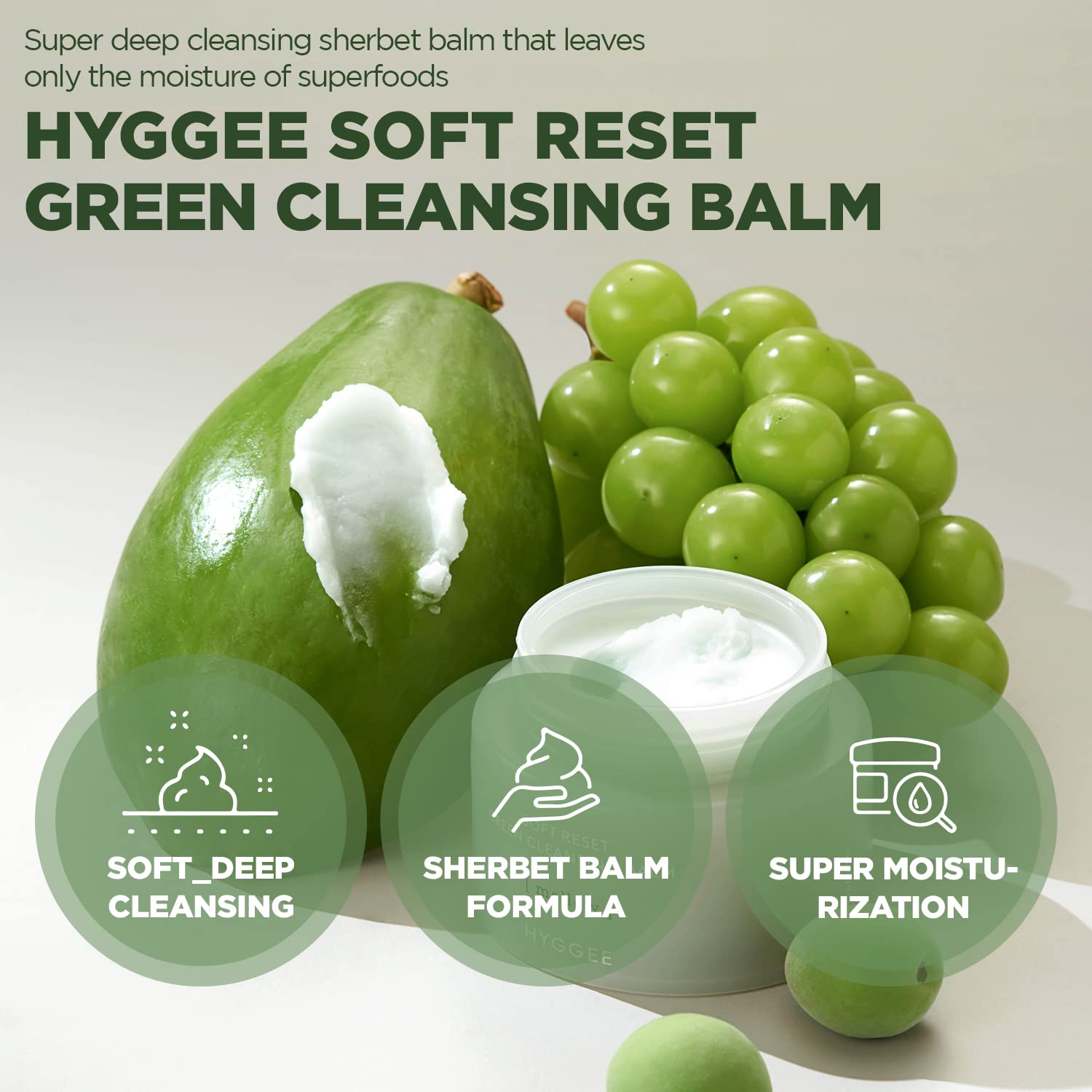 SUPER DEEP CLEANSING BALM: Hyggee Soft Reset Green Cleansing Balm is a soft cleaning sherbet-type formula that melts the moment it touches the skin and leaves only the moisture of the superfoods. This cleansing balm for face gently deep cleans up to point of makeup, wastes, and old dead skin cells