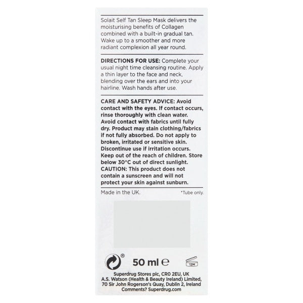 Product Information:Solait Self Tan Sleep Mask Delivers The Moisturising Benefits Of Collagen Combined With A Built-In Gradual Tan,Features:Self Tan Sleep Mask With Collagen Gradual For Face Hydrating Long-Lasting,Warning Or Restrictions:Keep Out Of The Reach Of Children. This Product Does Not Contain A Sunscreen And Will Not Protect Your Skin Against Sunburn,Product Specification:Product Code: 814789,Recyclable:Card Recycled Tube - Cap On Recycle