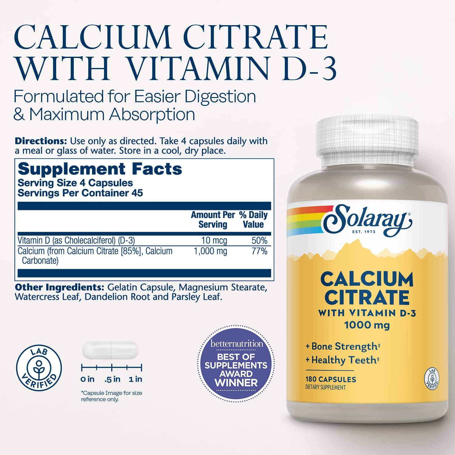 Solaray Calcium Citrate With Vitamin D3 1000Mg - Bone Strength And Healthy Teeth Support - Gentle Digestion Formula - Lab Verified, 60-Day Guarantee - 30 Servings, 180 Capsules