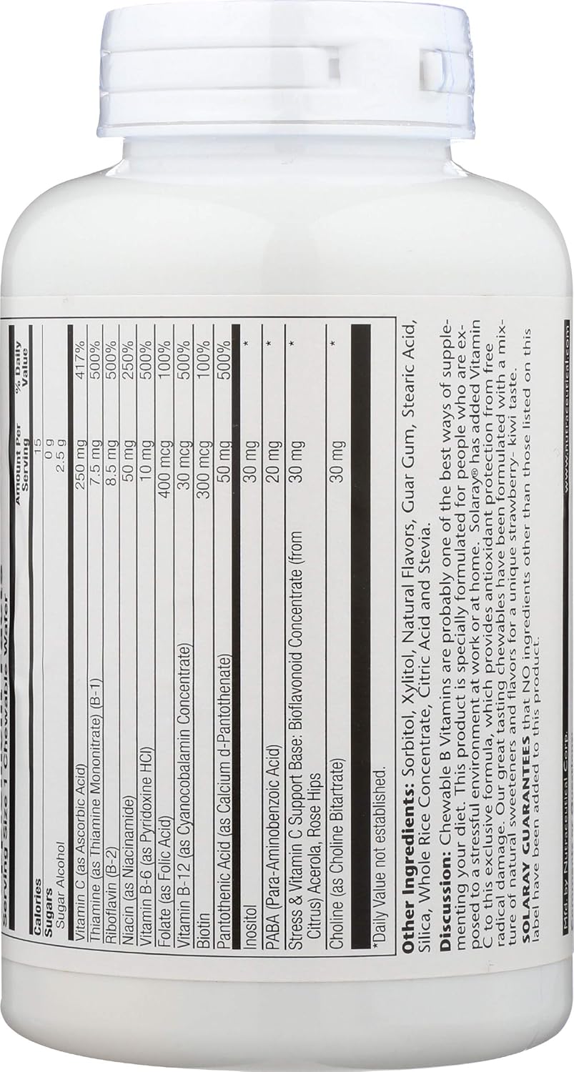 Chewable B Vitamins Are Probably One Of The Best Ways Of Supplementing Your Diet. This Product Is Specially Formulated For People Who Are Exposed To A Stressful Environment At Work Or At Home. Solaray Has Added Vitamin C To This Exclusive Formula, Which Provides Antioxidant Protection From Free Radical Damage. These Great Tasting Chewables Have Been Formulated With A Mixture Of Natural Sweeteners And Flavors For A Unique Strawberry Taste