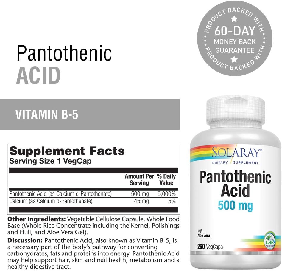DESCRIPTION : SOLARAY Pantothenic Acid 500mg Vitamin B-5 for Coenzyme-A Production & Energy Metabolism for Hair, Skin, Nails & Digestive Support 250 VegCaps