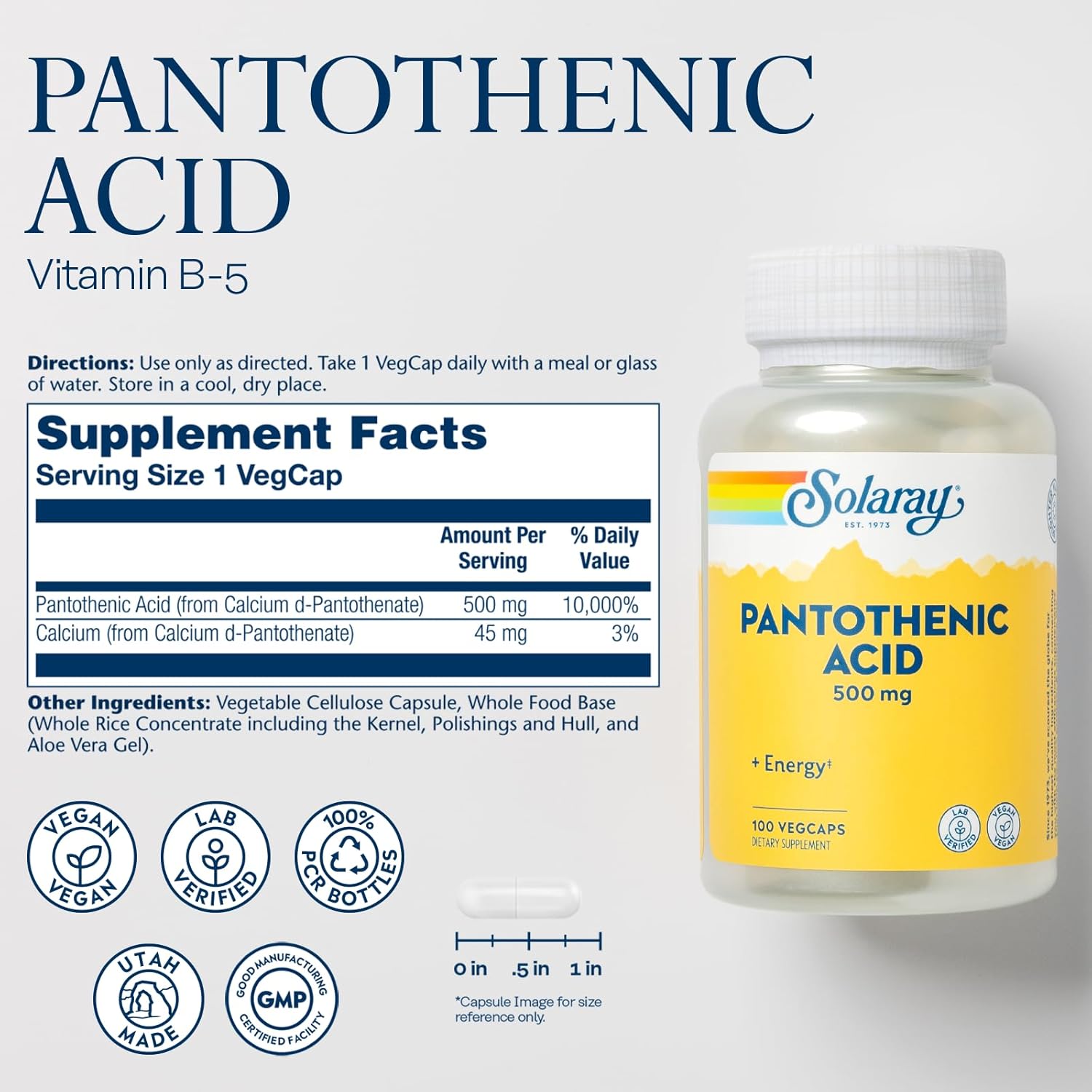 Solaray Pantothenic Acid 500Mg - Vitamin B 5 For Coenzyme-A Production And Energy Metabolism, Hair, Skin, And Nails Support - Vegan, Lab Verified, 60-Day Guarantee - 100 Servings, 100 Vegcaps