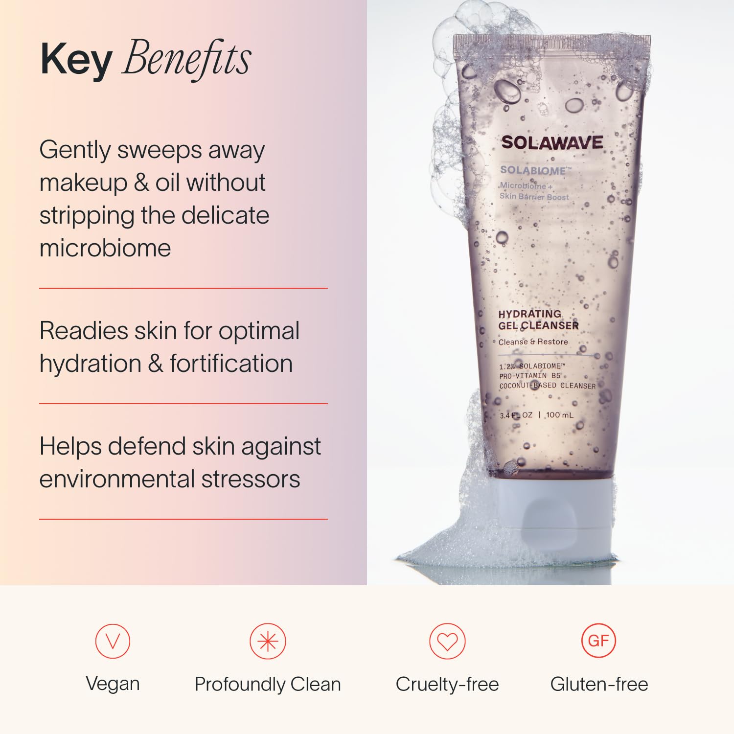 Solawave Probiotic Gel Facial Cleanser With Prebiotics And Pro Vitamin B5, Hydrating And Soothing Formula To Remove Makeup And Reduce Blemishes - Non-Comedogenic For All Skin Types (3.4 Fl Oz)