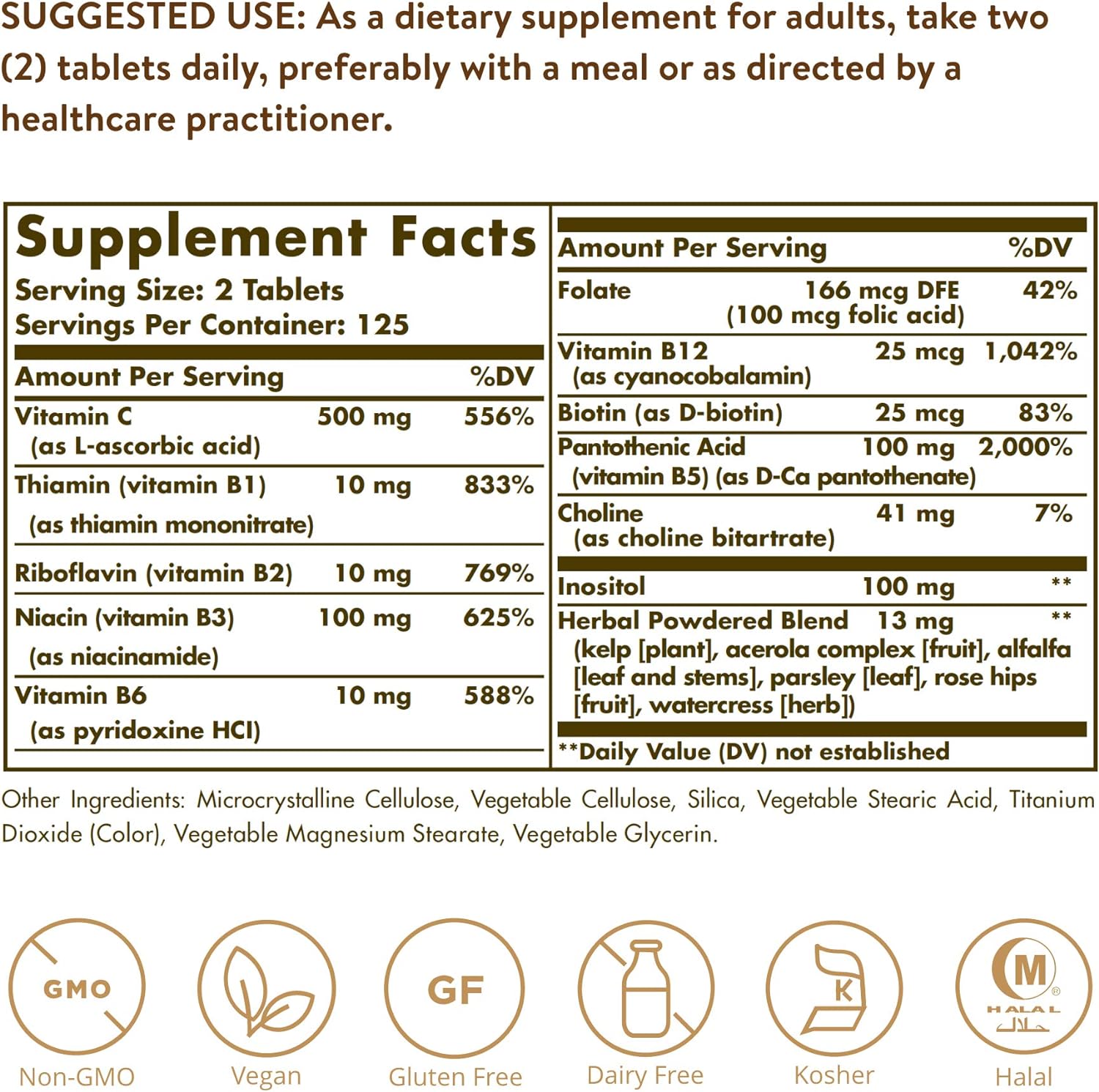 Solgar B-Complex with Vitamin C Stress Formula, 250 Tablets - Energy Metabolism, Nervous System & Immune Support - Non-GMO, Vegan, Gluten Free, Dairy Free, Kosher, Halal - 125 Servings