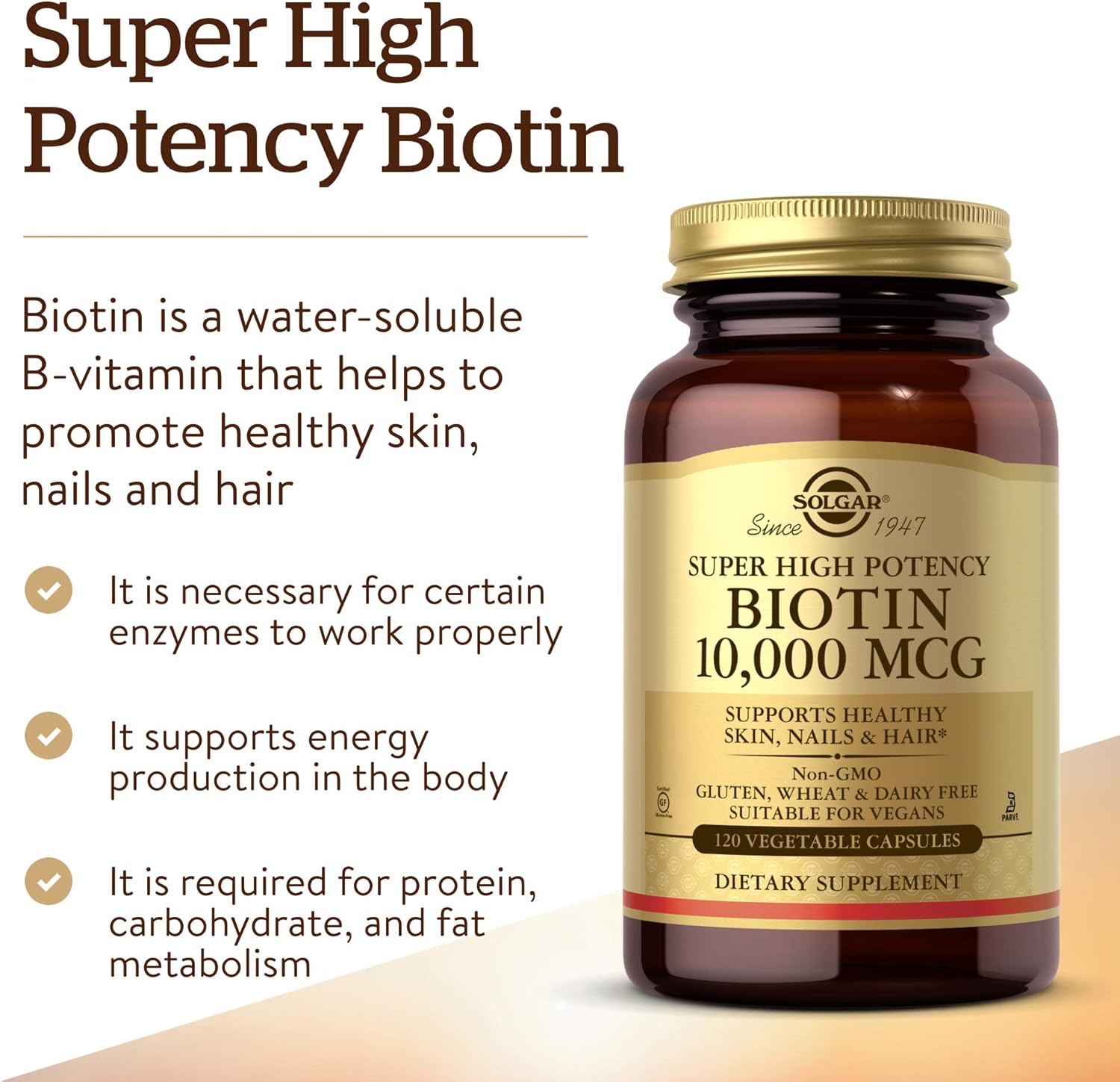 Solgar Biotin 10,000 Mcg, 120 Vegetable Capsules - Energy, Metabolism, Promotes Healthy Skin, Nails & Hair - Super High Potency - Non-Gmo, Vegan, Gluten, Dairy Free, Kosher - 120 Servings
