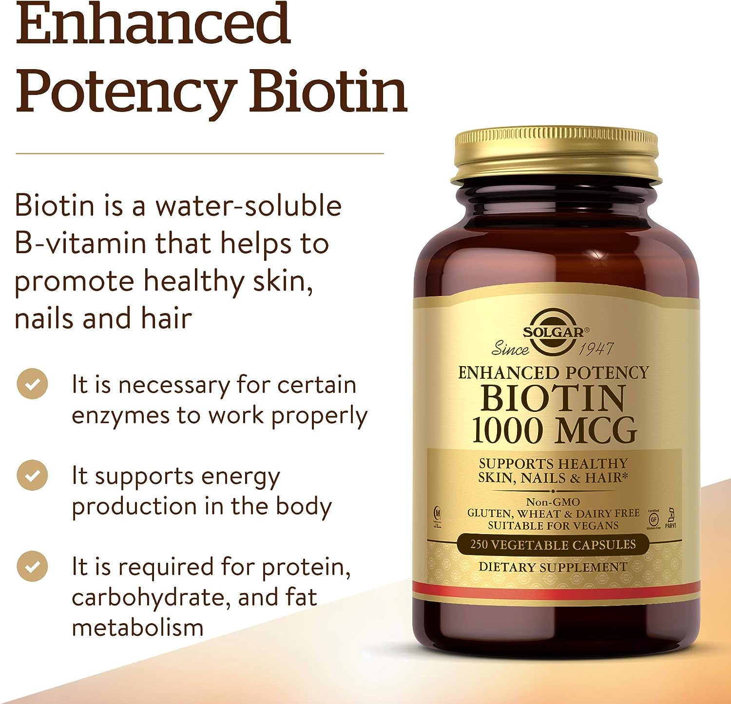 DESCRIPTION : Solgar Biotin 1000 mcg, 250 Vegetable Capsules - Supports Healthy Skin, Nails & Hair - Energy Metabolism - Enhanced Potency - Non-GMO, Vegan, Gluten Free, Dairy Free, Kosher, Halal - 250 Servings