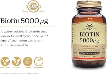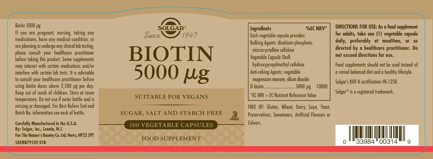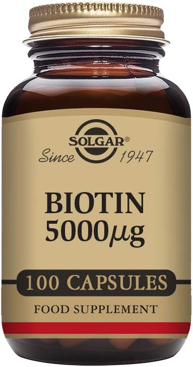 Solgar Biotin 5000 Mcg, 100 Veg Caps - Promote Healthy Skin, Nails & Hair - Supports Energy Production, Protein, Carbohydrate & Fat Metabolism - Vitamin B - Non Gmo, Vegan, Gluten Free - 100 Servings
