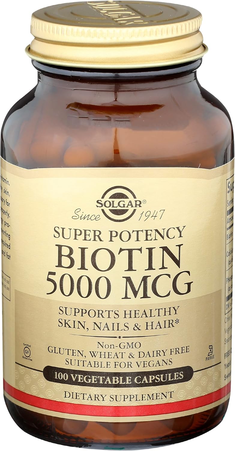 SHOP SOLGAR IMMUNE SUPPORT NOW FOLLOW US: Follow us on Facebook Follow us on Instagram Follow us on Youtube Biotin is a water-soluble B-vitamin. It helps to support healthy skin, nails and hair, and is necessary for certain enzymes to work properly.* Biotin also supports cellular energy production in the body by converting food into energy, and is required for protein, carbohydrate, and fat metabolism.* As a dietary supplement for adults, take one (1) vegetable capsule daily, preferably with a meal or as directed by a healthcare practitioner. Serving Size: 1 Vegetable Capsule Amount Per Serving %DV Biotin 5,000 mcg 16,667% Calcium (as dicalcium phosphate) 148 mg 11% Phosphorus (as dicalcium phosphate) 115 mg 9% *Daily Value (DV) not established Ingredients Microcrystalline Cellulose, Vegetable Cellulose, Vegetable Magnesium Stearate, Silica. Free of Gluten, Wheat, Yeast, Sugar, Salt, Artificial Flavors, Artificial Sweeteners, Artificial Colors Warnings If you are pregnant, nursing, taking any medications, have any medical condition, or are planning to undergo any clinical lab testing, consult your healthcare practitioner before use. Some supplements may interact with certain medications and/or interfere with certain lab tests. It is advisable to consult your healthcare practitioner before using biotin doses above 2,500 mcg per day. If any adverse reactions occur, stop use and consult your healthcare practitioner. Keep out of reach of children. Store at room temperature. Do not use if outer bottle seal is missing or damaged. Trademarks Solgar’s KOF-K certification # K-1250 Size: 50 UPC 033984003132Size: 100 UPC 033984003149 The Gold Standard Since 1947 For 75 years Solgar® has been committed to quality, health, and well-being. Our ongoing mission is to create the finest nutritional supplements in small batches, made possible through tireless research, using only the finest raw materials. When it comes to quality, Solgar® is The Gold Standard. We continuously push ourselves to deliver to The Gold Standard. Science-Backed Formulas Responsibly Sourced Ingredients Avoiding the Use of Artificial Ingredients or Fillers Small Batch, In-House Manufacturing Highest Quality Standards: USP Water Filtration, HEPA Air Filtration At Solgar®, quality isn’t a word we use casually — it’s a way of life. It has been our guiding principle since 1947 and is deeply ingrained in every step we take. You might also like Follow Us Facebook Instagram YouTube Products General Health Bone & Joint Support Immune Support Sleep Support Stress Support Energy Support Beauty Fitness & Nutrition Heart Health Digestive Health Brain Health Eye Health Solgar Company Contact Products Articles Where To Buy Privacy Policy Terms of Use Worldwide Retailer Resources Join Our Community Enter your email to join the Solgar community and receive updates whenever new and exciting things are happening with Solgar! Email* * By checking this box, I certify that the email address provided is my personal email address, and I have read and agreed to the current Terms of use and Privacy Policy * By checking this box, I certify that I am located in the United States and I agree to allow Solgar® to use my email to send me all news, offers, and announcements about Solgar®. Comments This field is for validation purposes and should be left unchanged. gform.initializeOnLoaded( function() {gformInitSpinner( 2, 'https://www.solgar.com/wp-content/themes/bstro-launchpad-solgar/images/loader.svg' );jQuery('#gform_ajax_frame_2').on('load',function(){var contents = jQuery(this).contents().find('*').html();var is_postback = contents.indexOf('GF_AJAX_POSTBACK') >= 0;if(!is_postback){return;}var form_content = jQuery(this).contents().find('#gform_wrapper_2');var is_confirmation = jQuery(this).contents().find('#gform_confirmation_wrapper_2').length > 0;var is_redirect = contents.indexOf('gformRedirect(){') >= 0;var is_form = form_content.length > 0 && ! is_redirect && ! is_confirmation;var mt = parseInt(jQuery('html').css('margin-top'), 10) + parseInt(jQuery('body').css('margin-top'), 10) + 100;if(is_form){jQuery('#gform_wrapper_2').html(form_content.html());if(form_content.hasClass('gform_validation_error')){jQuery('#gform_wrapper_2').addClass('gform_validation_error');} else {jQuery('#gform_wrapper_2').removeClass('gform_validation_error');}setTimeout( function() { /* delay the scroll by 50 milliseconds to fix a bug in chrome */ }, 50 );if(window['gformInitDatepicker']) {gformInitDatepicker();}if(window['gformInitPriceFields']) {gformInitPriceFields();}var current_page = jQuery('#gform_source_page_number_2').val();gformInitSpinner( 2, 'https://www.solgar.com/wp-content/themes/bstro-launchpad-solgar/images/loader.svg' );jQuery(document).trigger('gform_page_loaded', [2, current_page]);window['gf_submitting_2'] = false;}else if(!is_redirect){var confirmation_content = jQuery(this).contents().find('.GF_AJAX_POSTBACK').html();if(!confirmation_content){confirmation_content = contents;}setTimeout(function(){jQuery('#gform_wrapper_2').replaceWith(confirmation_content);jQuery(document).trigger('gform_confirmation_loaded', [2]);window['gf_submitting_2'] = false;wp.a11y.speak(jQuery('#gform_confirmation_message_2').text());}, 50);}else{jQuery('#gform_2').append(contents);if(window['gformRedirect']) {gformRedirect();}}jQuery(document).trigger('gform_post_render', [2, current_page]);} );} ); *These statements have not been evaluated by the Food and Drug Administration. These products are not intended to diagnose, treat, cure or prevent any disease. © 2022 Solgar Inc
