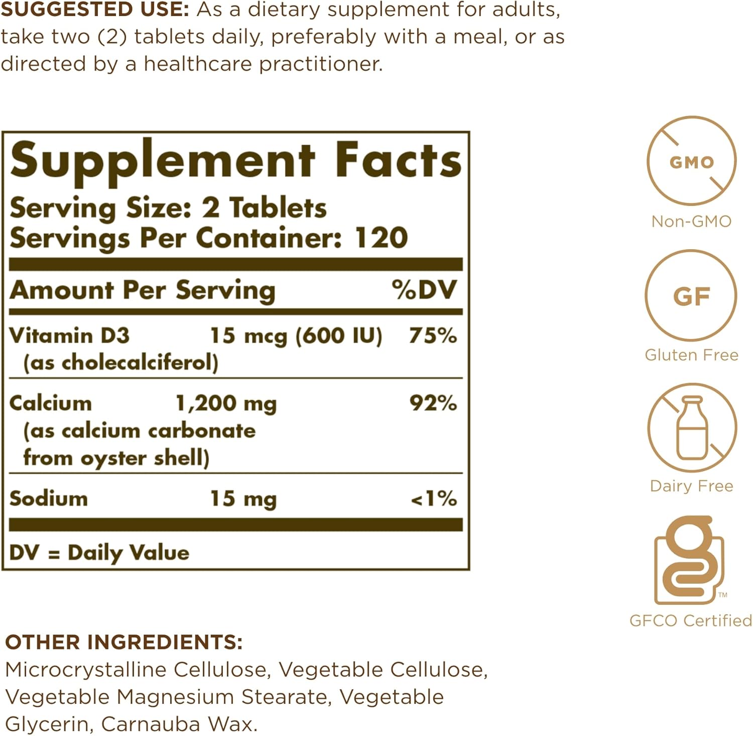 Solgar Calcium 600" - 240 Tablets, Pack Of 2 - From Oyster Shell With Vitamin D3 - Non-Gmo, Gluten Free, Dairy Free - 240 Total Servings