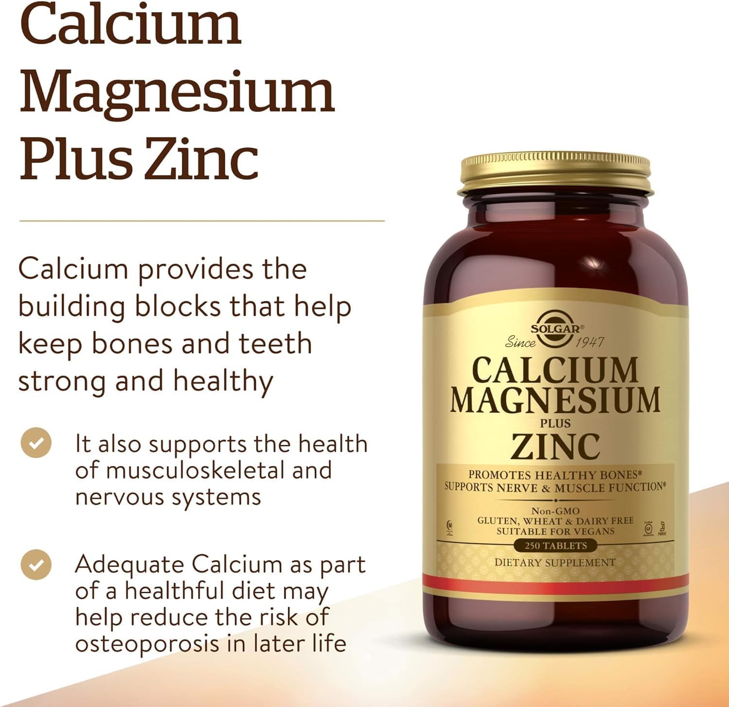 Solgar Calcium Magnesium Plus Zinc, 250 Tablets - Promotes Healthy Bones And Teeth - Supports Nerve & Muscle Function - Non Gmo, Vegan, Gluten Free, Dairy Free, Kosher, Halal - 83 Servings