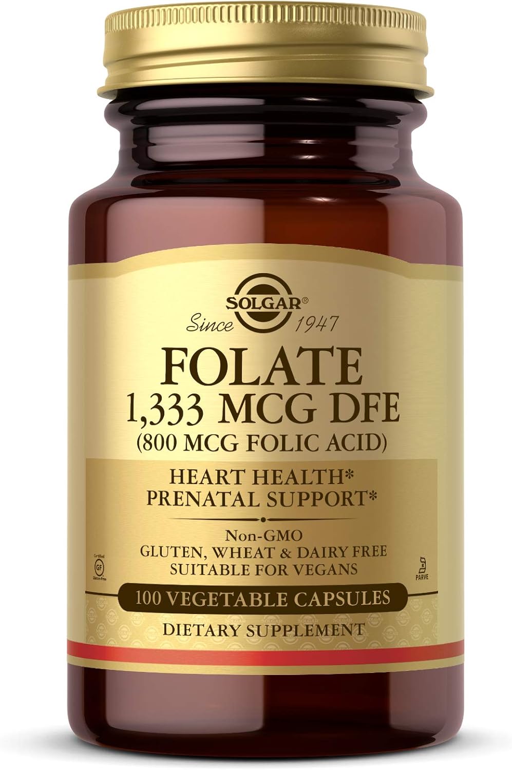 Solgar Folate 1,333 Mcg Dietary Folate Equivalent (800 Mcg Folic Acid), 100 Vegetable Capsules - Heart Health, Healthy Nervous System, Prenatal Support - Non-Gmo, Vegan, Gluten Free - 100 Servings